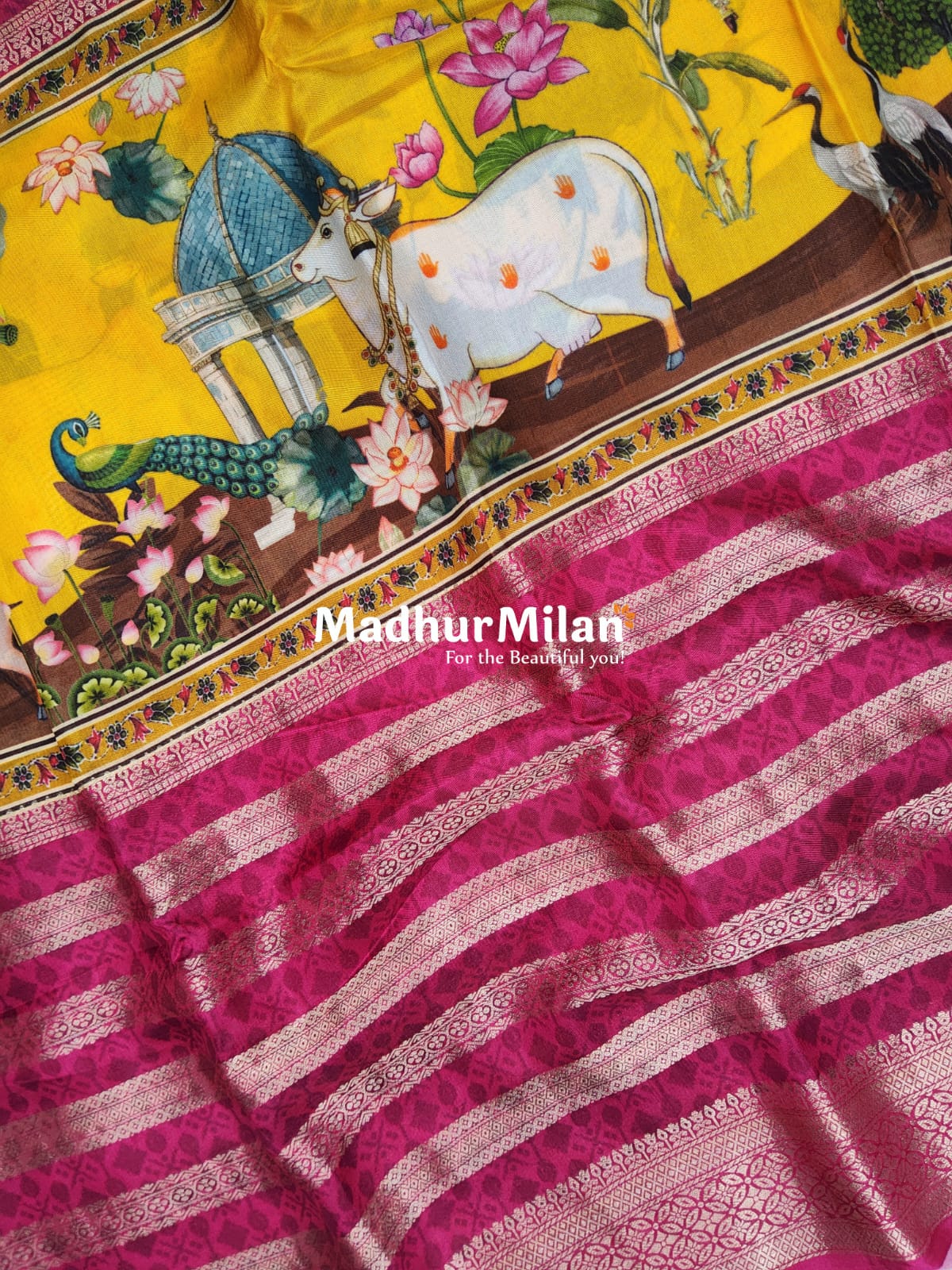 Immerse yourself in the vibrant beauty of Indian culture with our stunning CHITRA PRINTS CREPE SAREE in a captivating yellow and pink color combination.