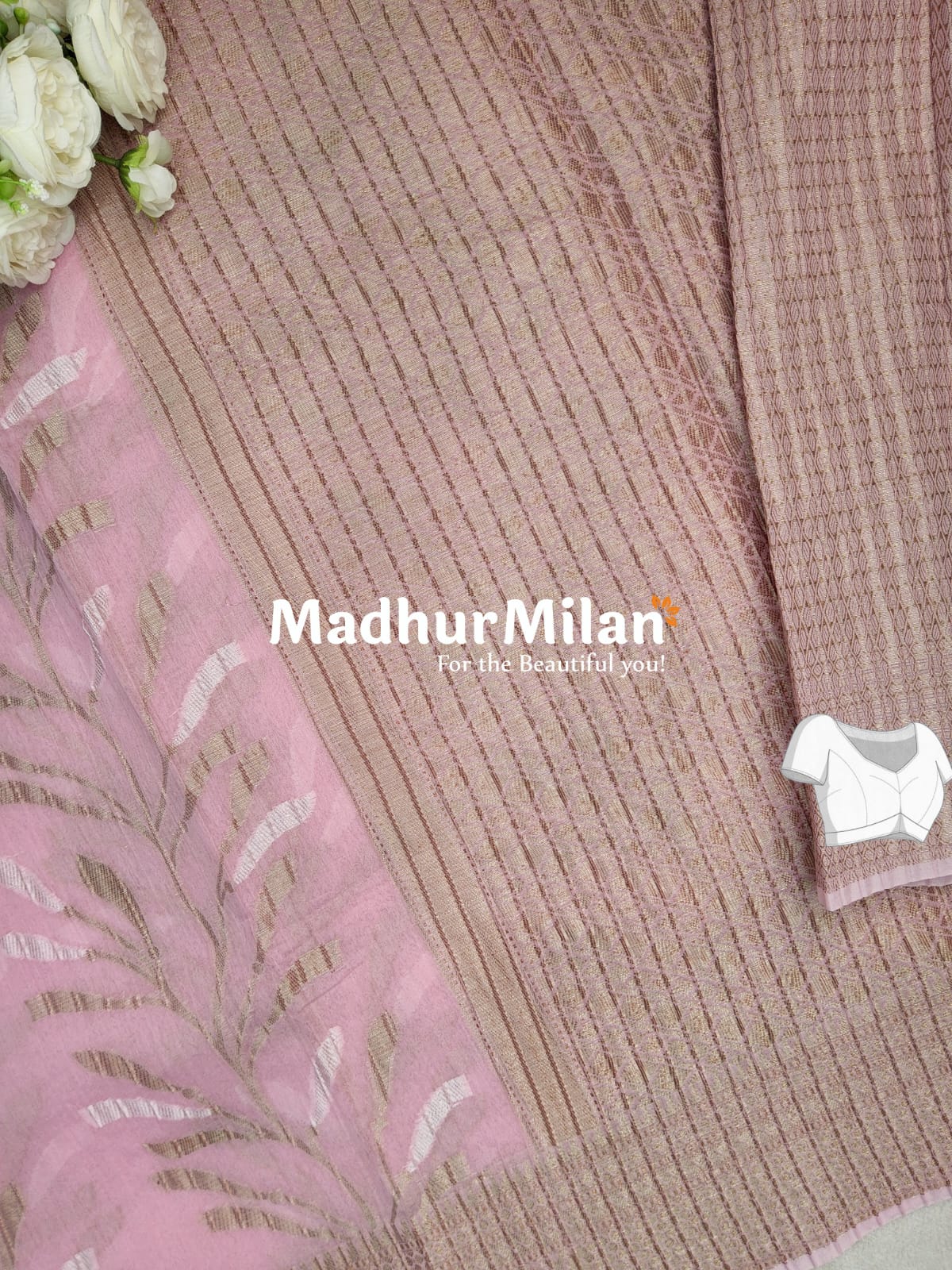 The saree's pink base is adorned with graceful golden leaf designs, creating a harmonious balance between simplicity and sophistication. The crushed texture adds a modern touch while ensuring easy draping and minimal creasing.