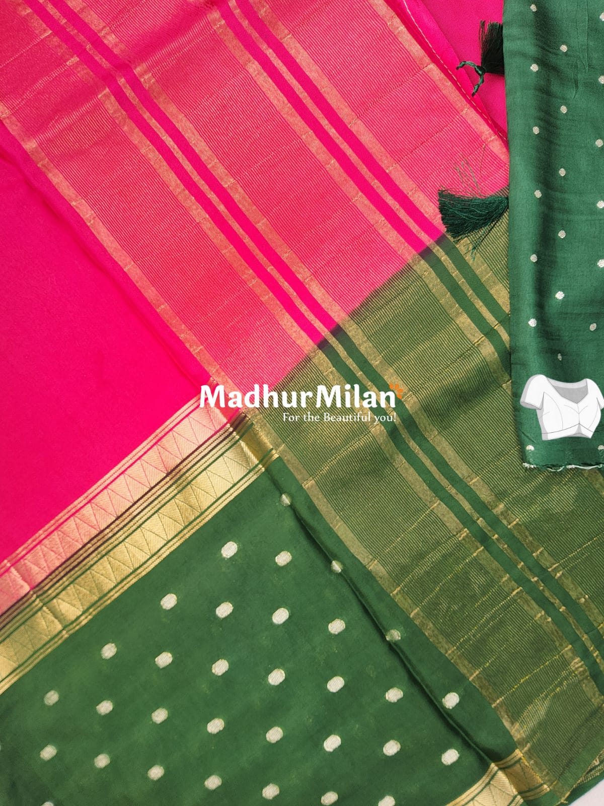 The saree showcases a luxurious pink body that exudes femininity and grace. The green pallu creates a beautiful contrast, featuring white polka dots and an elaborate golden zari border. The border work extends throughout the saree, adding a touch of opulence to the overall design. The soft crepe material ensures easy maintenance and comfortable wear, making it suitable for both festive occasions and formal events.