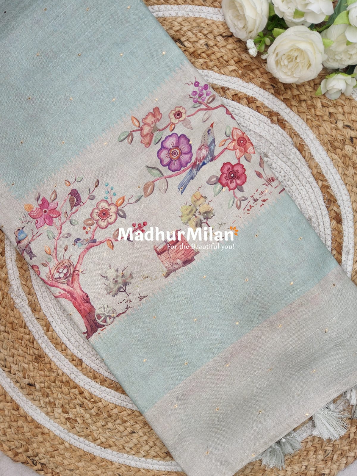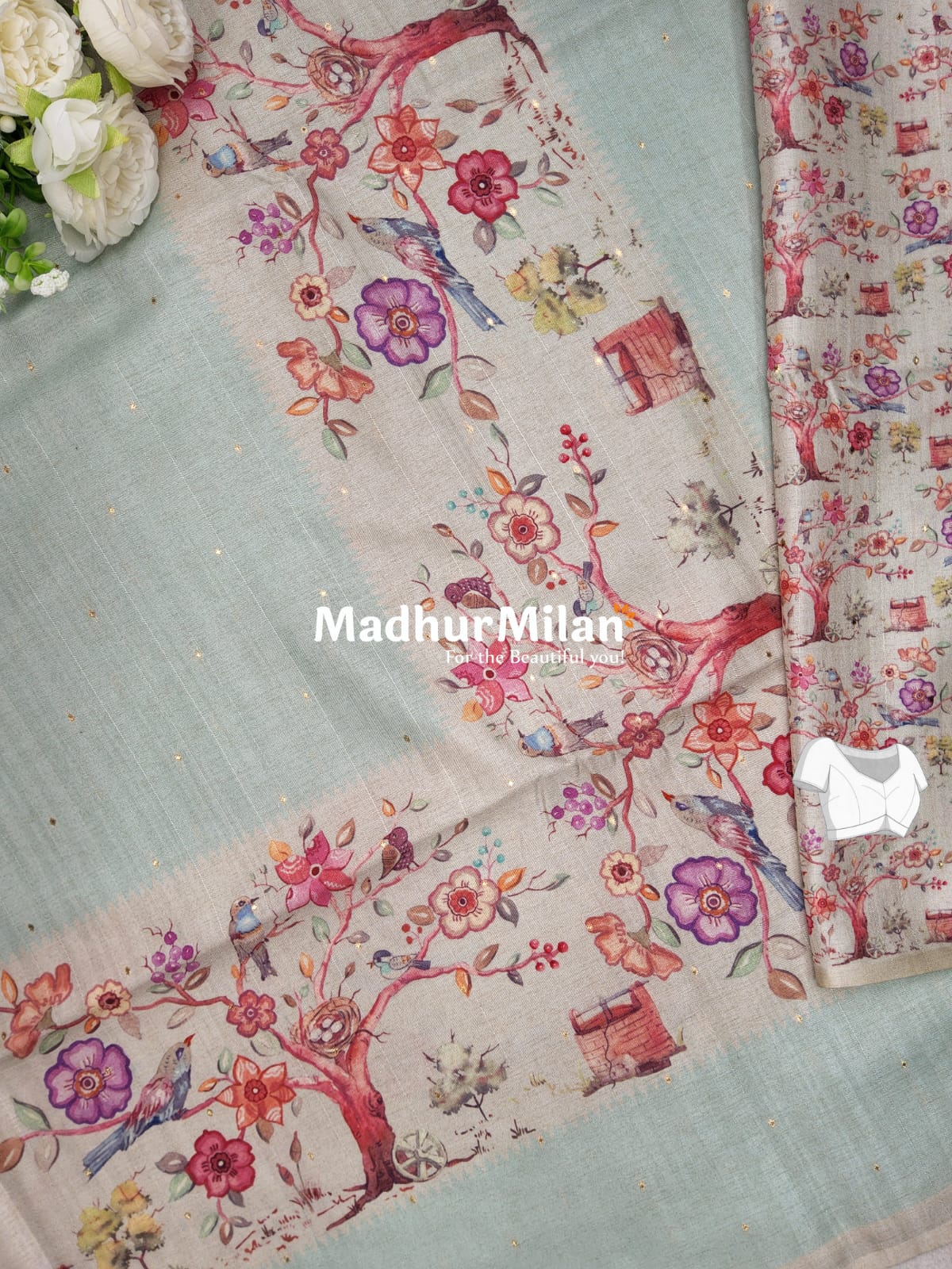 Product Description: DIGITAL SEMI TUSSER SILK SAREE DUSTY CYAN