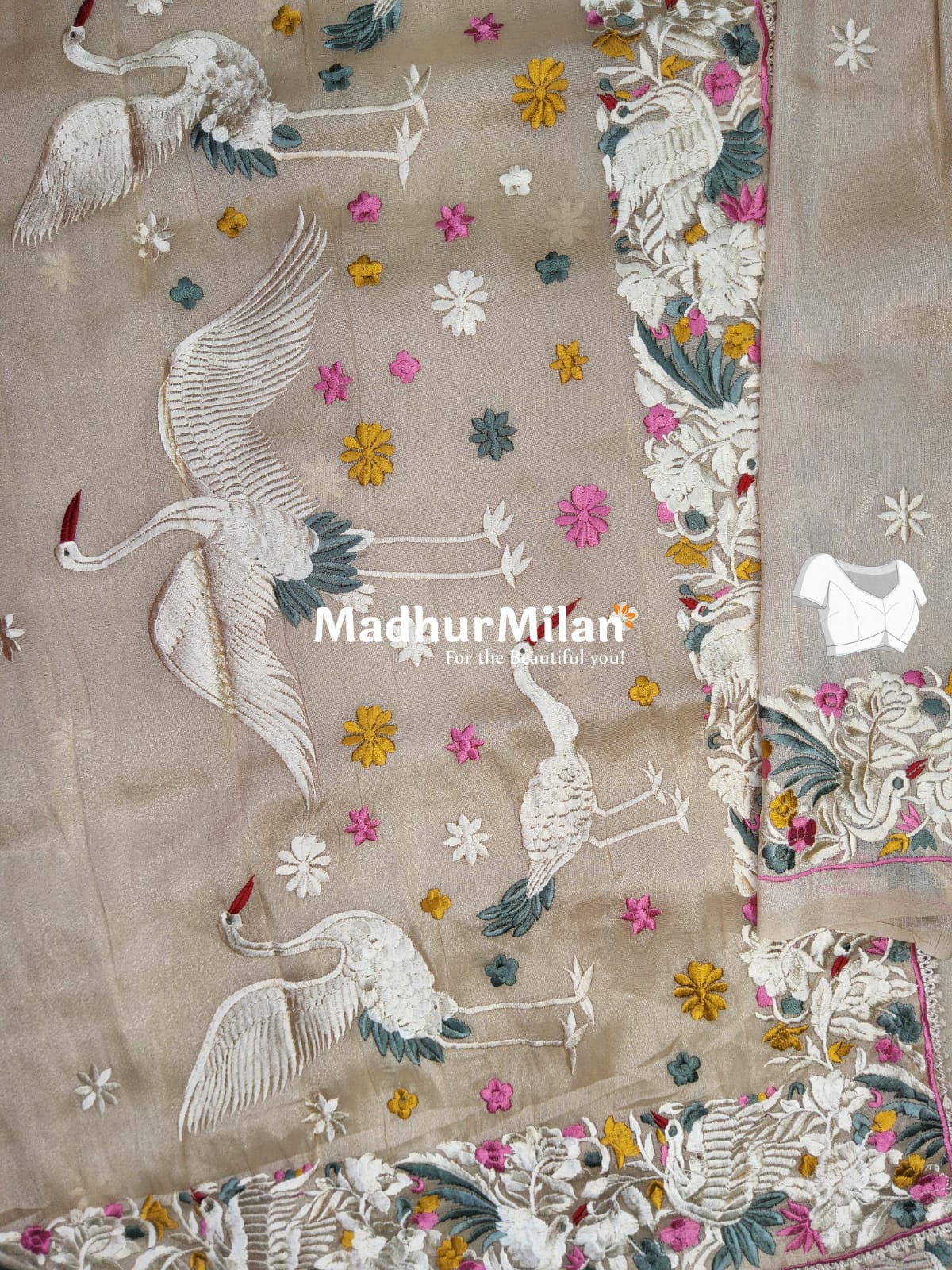 This saree is a true work of art, ideal for weddings, festivals, and special occasions. The dusty gold base provides a perfect canvas for the stunning embroidery, creating a mesmerizing interplay of colors and textures.