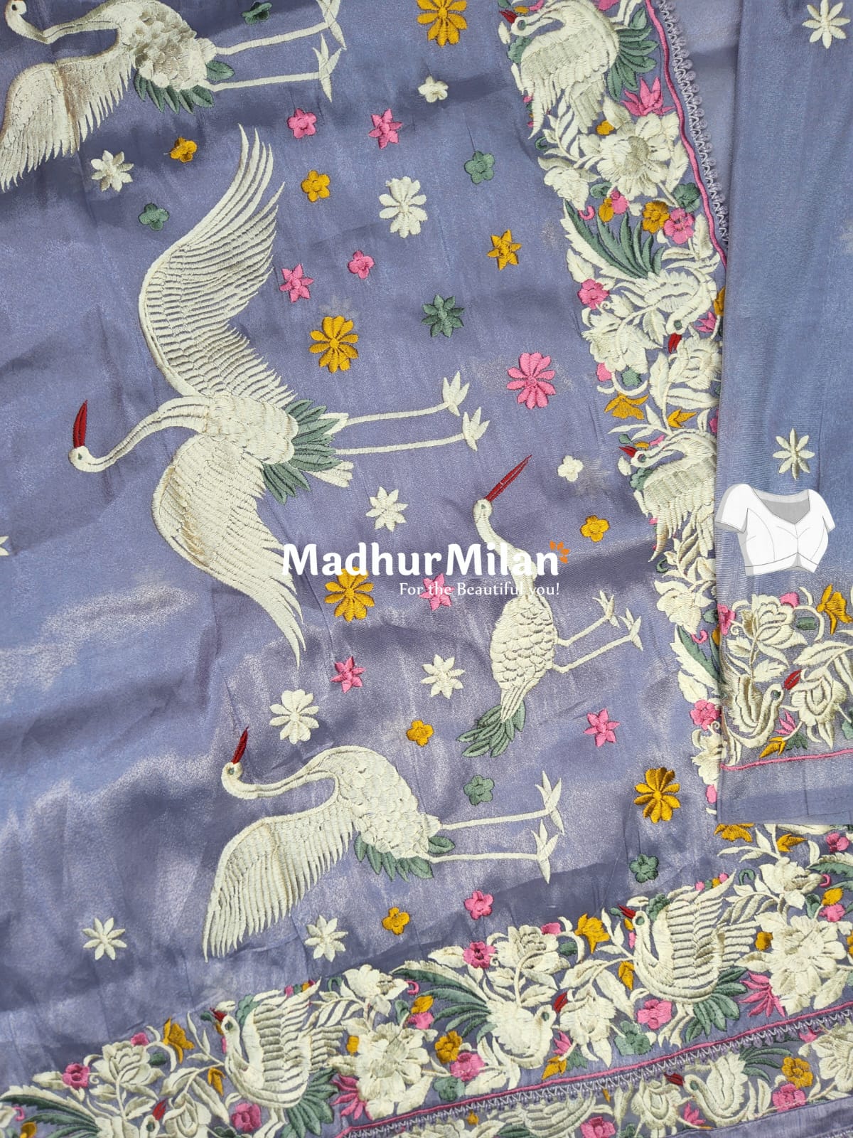 Description: Elevate your ethnic wardrobe with this exquisite Embroidery Border Tissue Organza Saree in a captivating Dusty Lavender hue.