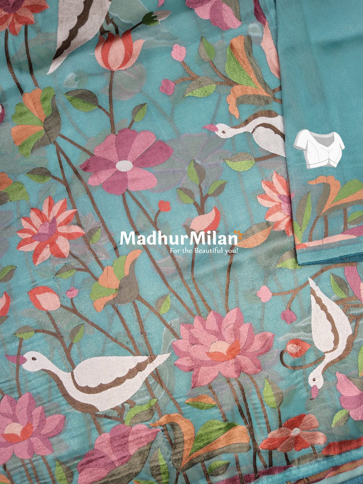 The saree showcases a mesmerizing scene of nature, with graceful flamingos and an array of flowers delicately embroidered across the fabric. The dusty rama base provides the perfect canvas for the colorful embroidery to pop, creating a striking visual effect.