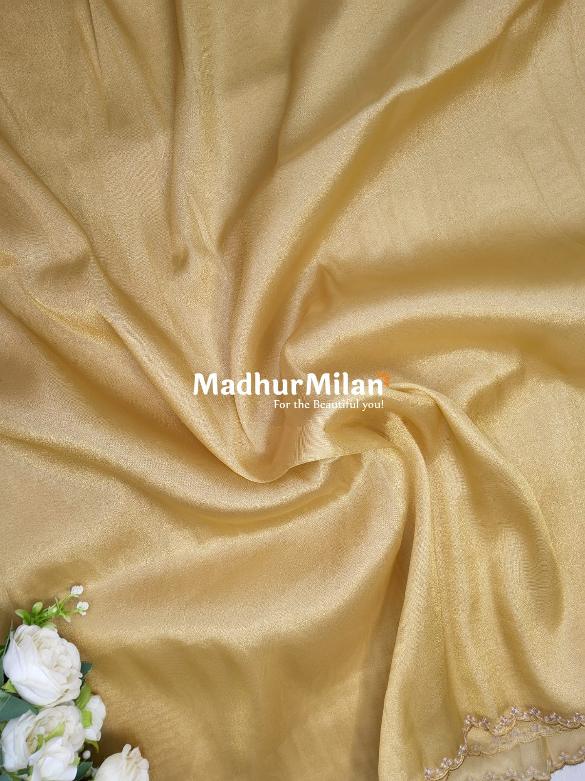 Elevate your ethnic wardrobe with this exquisite Floral Embroidery Tissue Organza Saree in Dusty Gold from Madhur Milan.