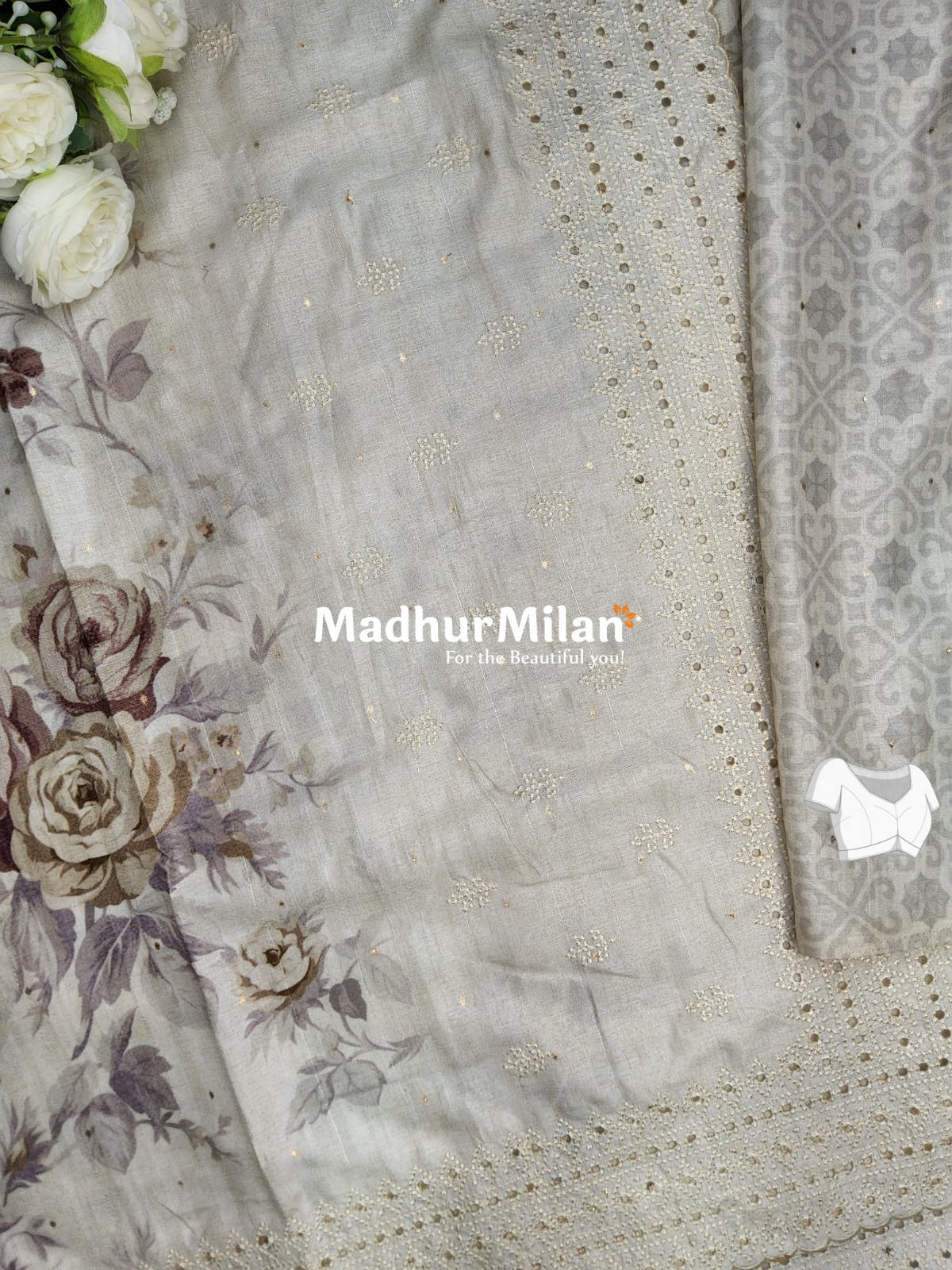 The saree's body features a soft dusty brown base adorned with elegant floral prints in muted tones, creating a harmonious and sophisticated look. The border is a true work of art, showcasing intricate embroidery with a scalloped edge and an eyelet pattern that adds depth and texture to the overall design. Scattered across the saree are delicate sequin embellishments, catching the light with every movement and adding a subtle glamour to your ensemble. The pallu combines the floral print with embroidered details, creating a stunning focal point for the saree.