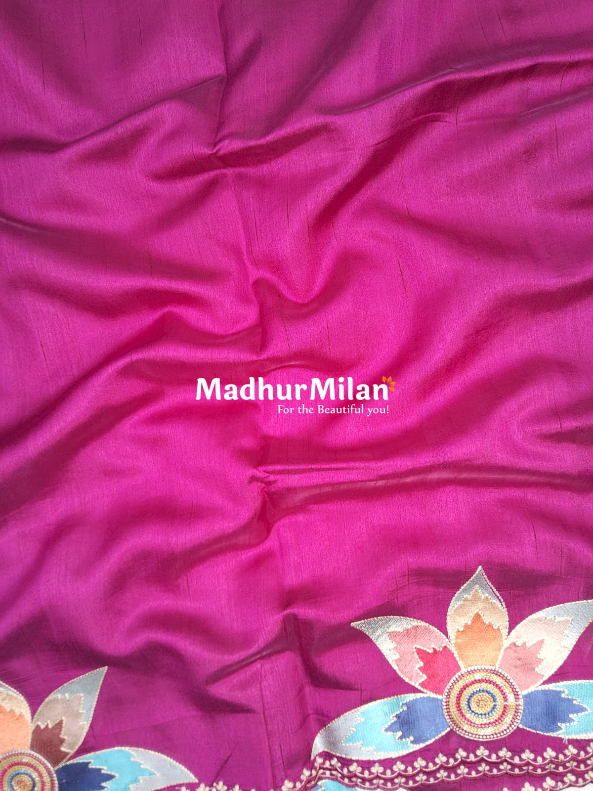The saree showcases a breathtaking floral design along the border, featuring a large, multi-petaled flower crafted with meticulous embroidery. The petals burst with a vibrant array of colors including soft pastels, bold reds, and soothing blues, creating a striking contrast against the wine-colored background. The pallu is adorned with an eye-catching arrangement of embroidered flowers, adding depth and dimension to the overall design. A subtle yet elegant golden thread work runs along the border, enhancing the saree's regal appearance.