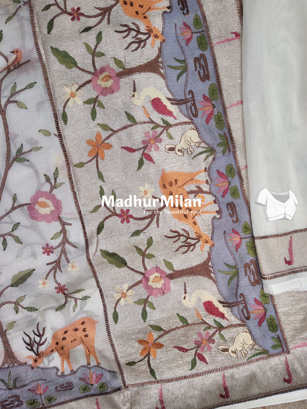 Detailed Embroidery: - The saree showcases a mesmerizing forest scene with embroidered trees, flowers, and various animals - Delicate branches with pink, orange, and white blossoms spread across the saree - Charming woodland creatures including deer, rabbits, and birds are intricately embroidered - A beautiful border in lavender adds depth and contrast to the design Border and Pallu: - The border features a distinct lavender band with additional floral and animal motifs - Pink accents along the edge provide a subtle pop of color - The pallu continues the woodland theme, creating a cohesive and stunning look Versatility: Perfect for weddings, festivals, and special occasions, this saree is sure to make you stand out with its unique and artistic design.