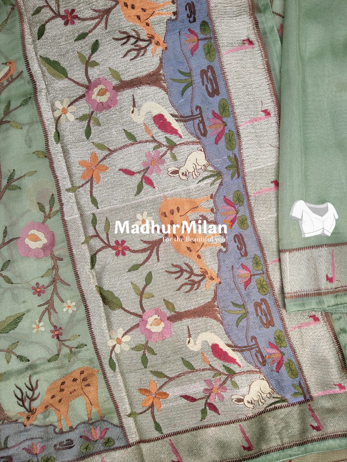 Design Details: - The saree showcases a mesmerizing woodland scene with delicately embroidered flora and fauna - Intricate embroidery depicts various animals including deer, birds, and rabbits nestled among flowering plants and trees - A beautiful border in shades of lavender and silver adds depth and contrast to the design - Delicate pink floral motifs are scattered throughout, adding a touch of femininity