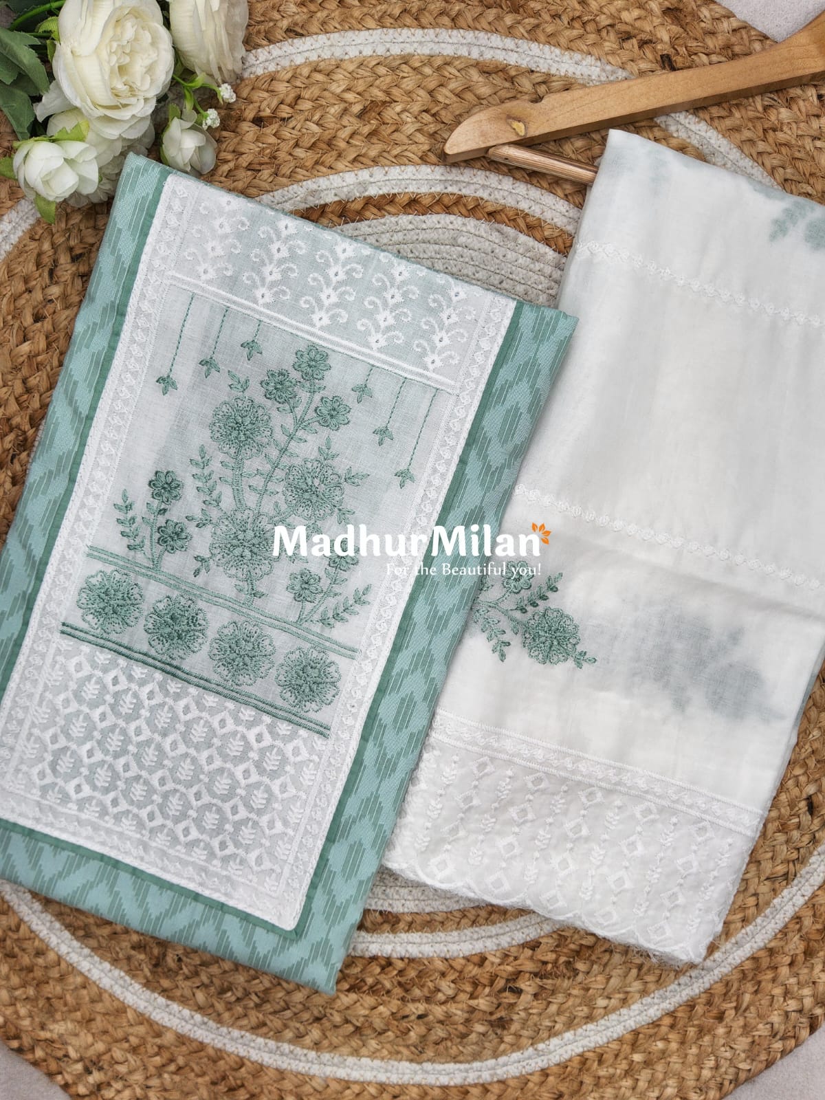The top fabric features a stunning panel with delicate floral embroidery, framed by intricate jacquard patterns. The white border with subtle geometric designs adds a touch of elegance to the overall look. The bottom fabric and dupatta come in pristine white, complementing the top beautifully.