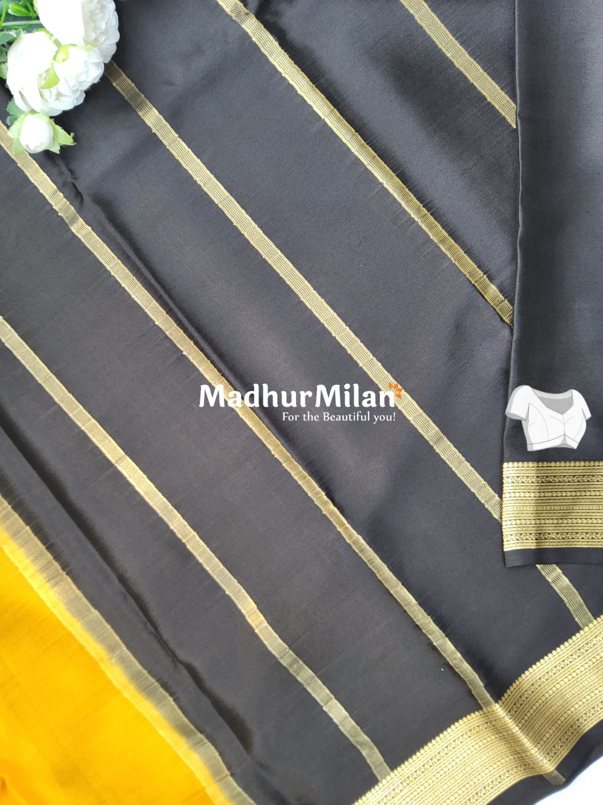 The saree's body showcases a rich golden yellow hue that exudes warmth and elegance. The 3-inch wide jari border runs along the edges, enhancing the saree's overall appeal with its intricate golden patterns. The pallu features a deep brown shade adorned with eye-catching golden stripes, creating a stunning visual contrast. This Madhur Milan creation is perfect for those who appreciate the finer things in life. The pure crepe silk fabric ensures comfort and a graceful drape, making it ideal for extended wear during special occasions.