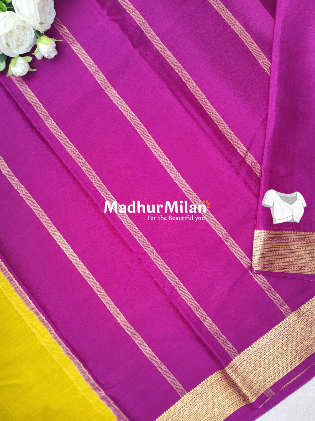 The main body of the saree showcases a radiant lemon yellow shade, symbolizing freshness and positivity. The contrasting wine-colored pallu and border create a striking visual appeal, perfect for both festive occasions and formal events. The 3-inch Jari border running along the saree's edge adds a touch of grandeur, while the pallu features beautiful golden zari stripes against the rich wine background, enhancing its royal appearance.