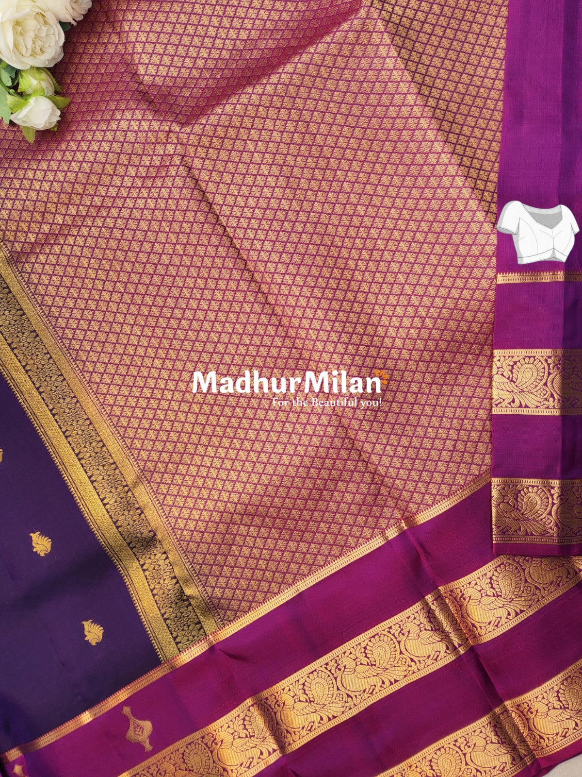 1. Rich Color Combination: The saree boasts a regal purple body adorned with intricate golden motifs, complemented by a striking pink border and pallu.
