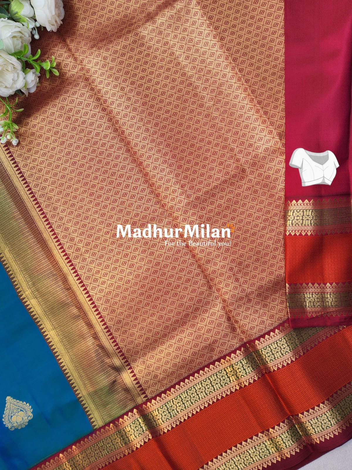 1. Vibrant Color Combination: The saree features a striking rama blue body adorned with elegant maroon and gold borders, creating a regal and eye-catching look.