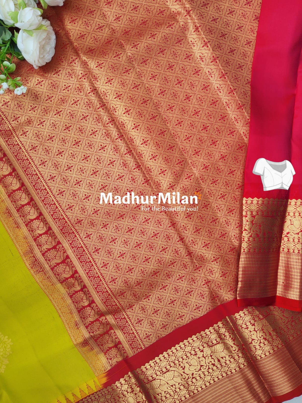 Key Features: 1. Vibrant Color Combination: The saree boasts a striking lemon-yellow body complemented by a rich red border, creating a eye-catching contrast.