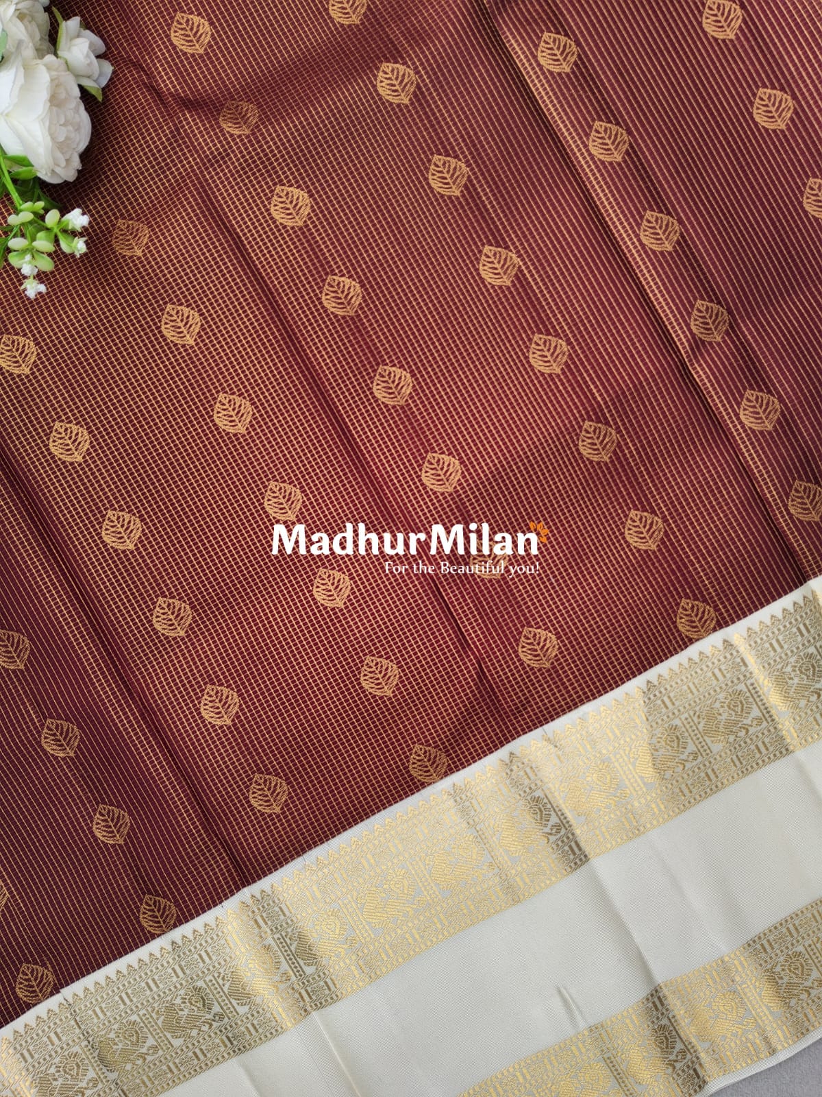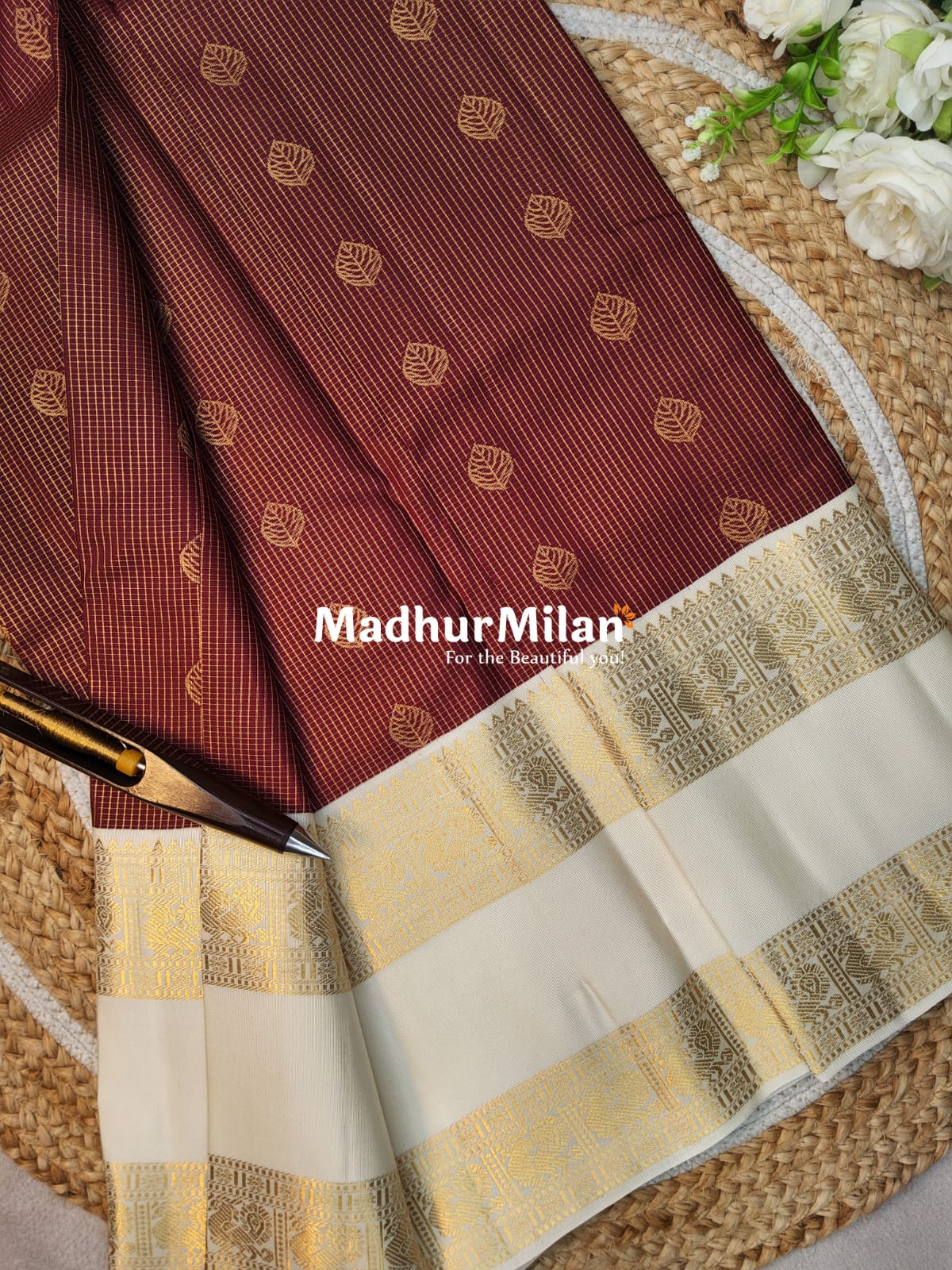 Product Description: Introducing the KANCHI CHECKS BUTTA BENTEX BORDER SAREE MAROON CREAM by Madhur Milan - a stunning blend of tradition and elegance for the beautiful you!