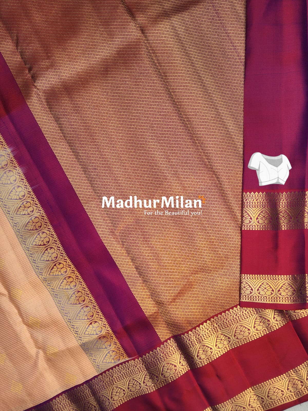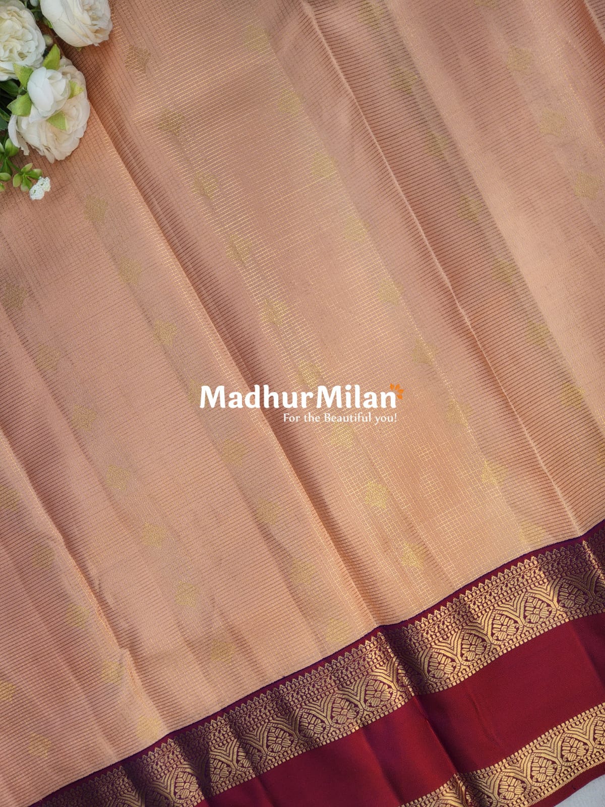 This saree epitomizes the perfect fusion of tradition and modernity. The subtle peach pink hue of the body is adorned with delicate golden butta motifs, creating a soft, elegant look. The striking maroon Bentex border and pallu, embellished with intricate golden zari work, provide a beautiful contrast and add a touch of grandeur to the ensemble. The fine striped texture of the fabric not only enhances its visual appeal but also ensures comfort and ease of draping.