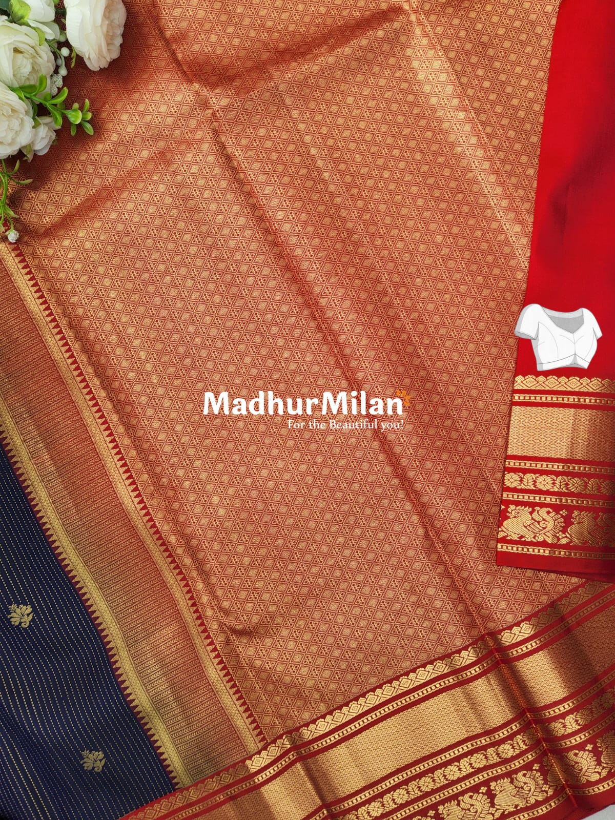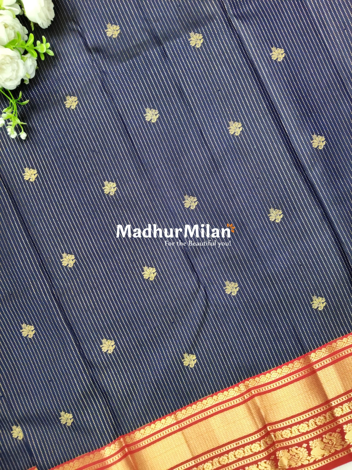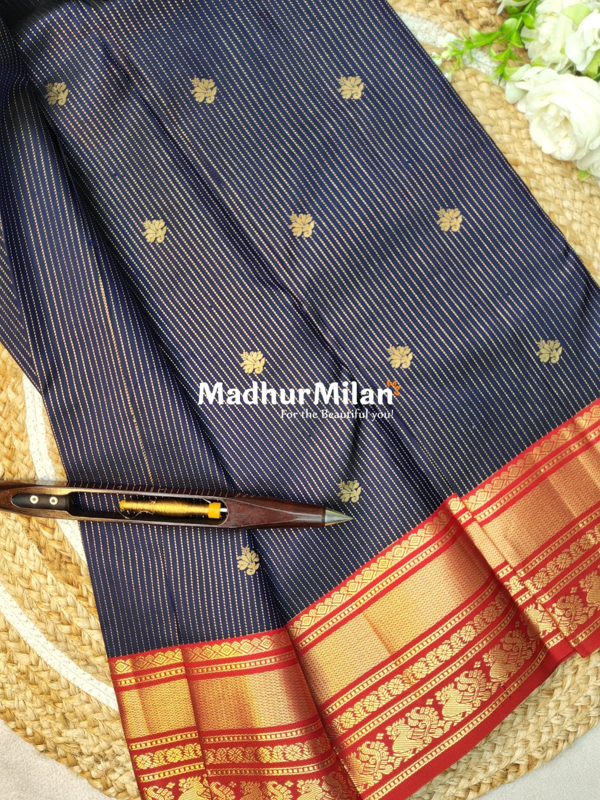 Product Name: KANCHI STRIPES BUTTA BORDER SAREE NAVY BLUE RED