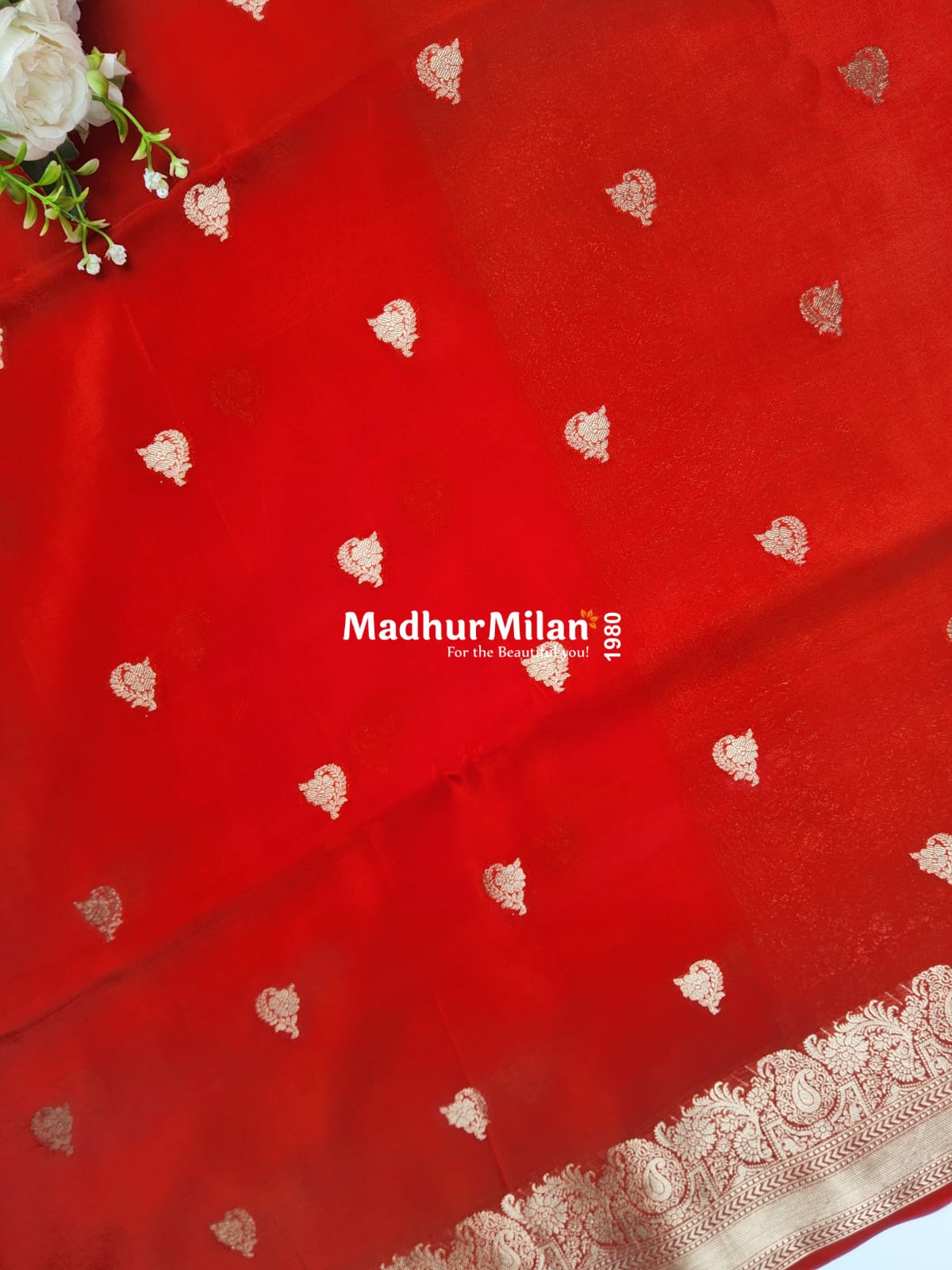 Product Description: BANARASI BUTTA RUSSIAN CREPE SAREE RED