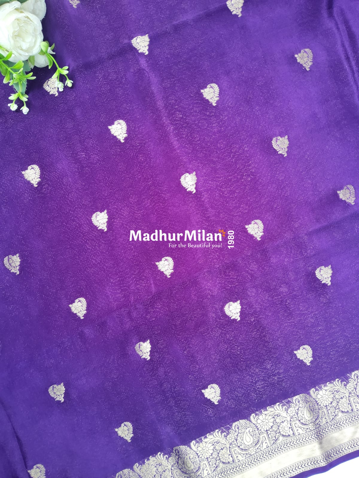 Introducing the exquisite BANARASI BUTTA RUSSIAN CREPE SAREE in a stunning Purple hue - a masterpiece of traditional Indian craftsmanship with a modern twist.