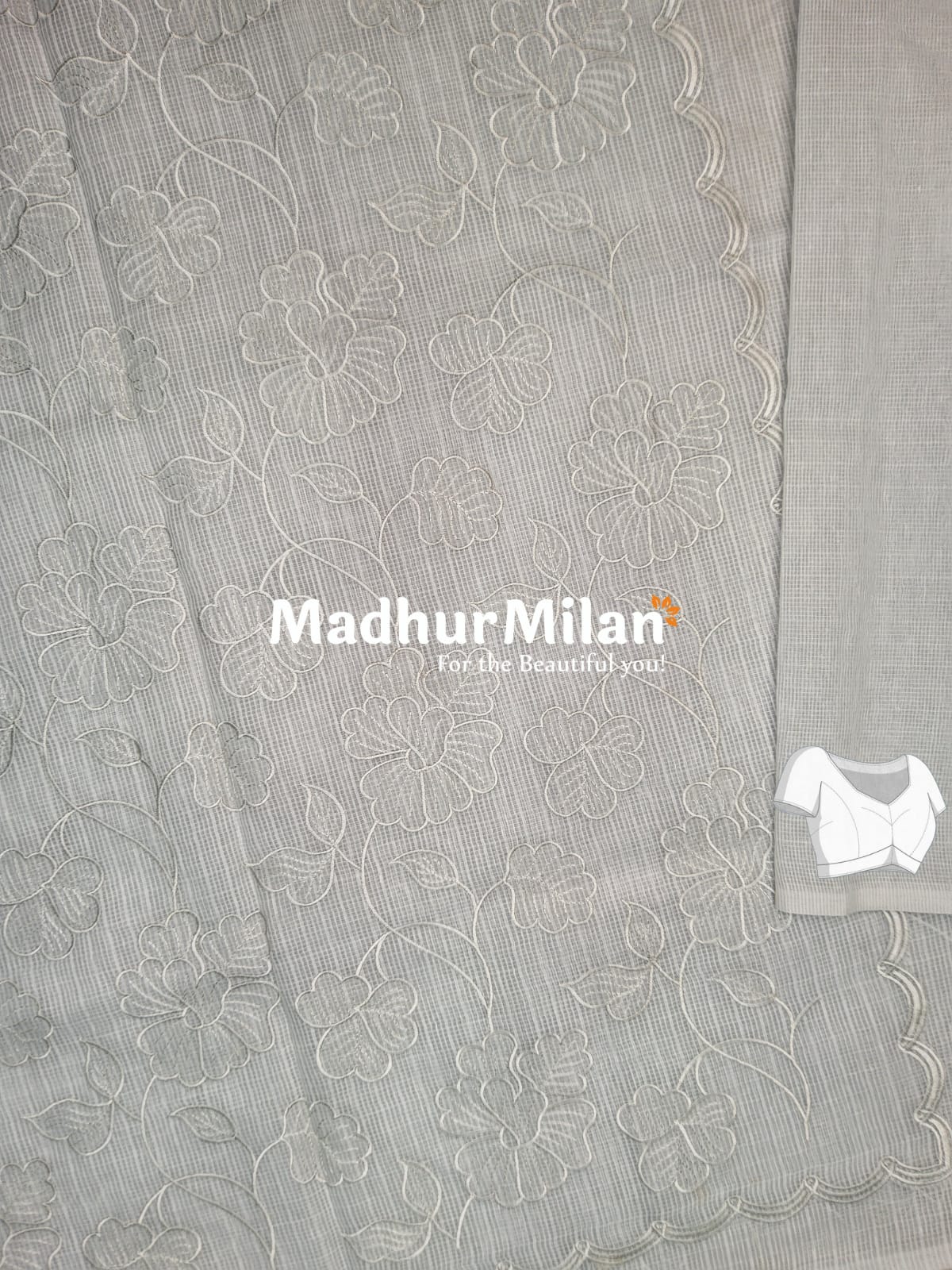 The saree features a stunning array of embroidered flowers and leaves, meticulously crafted to create a mesmerizing pattern across the entire fabric. The light grey background serves as a perfect canvas for the white embroidery, resulting in a subtle yet striking contrast.