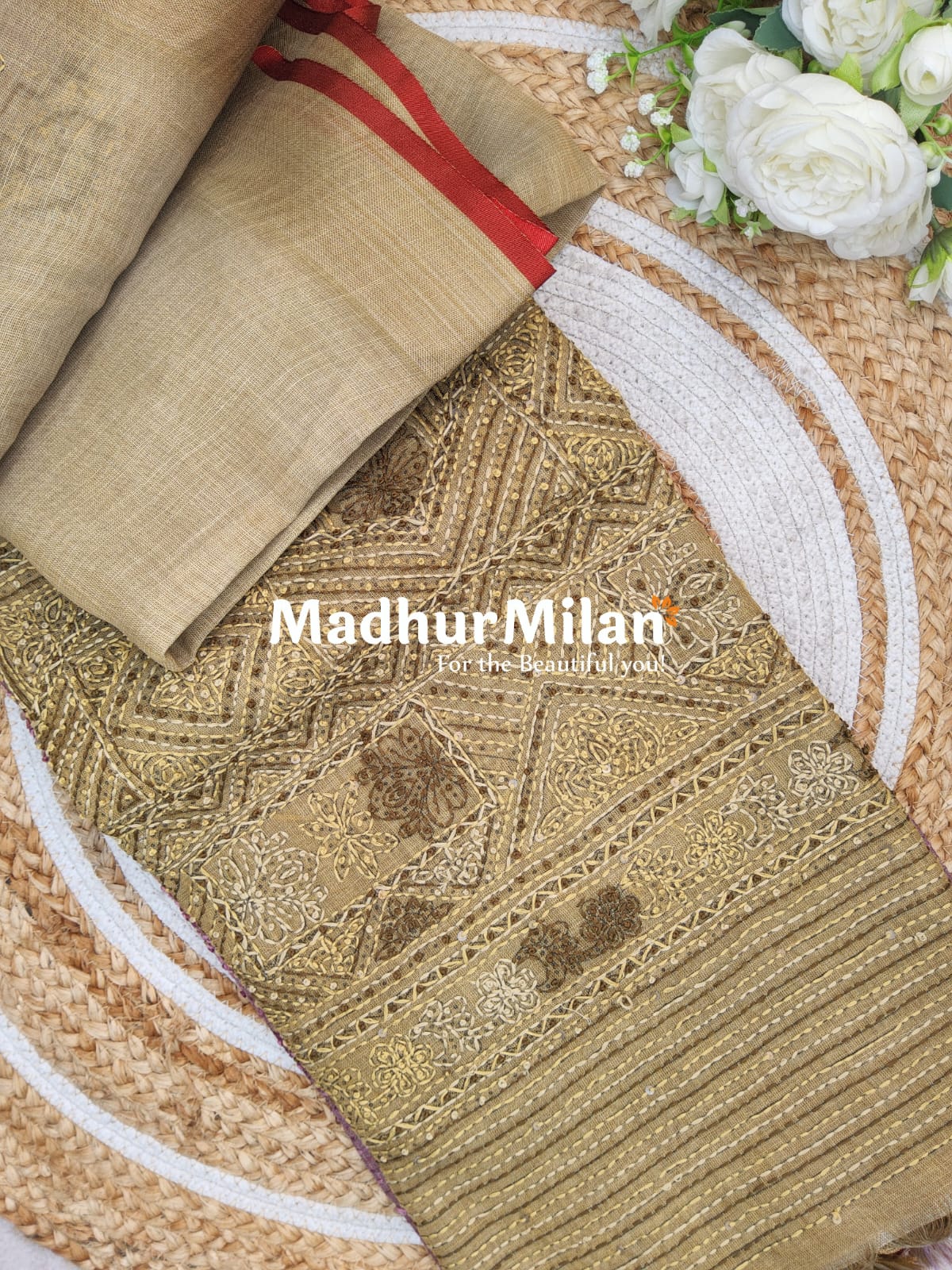Elevate your ethnic wardrobe with this exquisite Lenin Tissue Embroidery Work Saree from Madhur Milan.