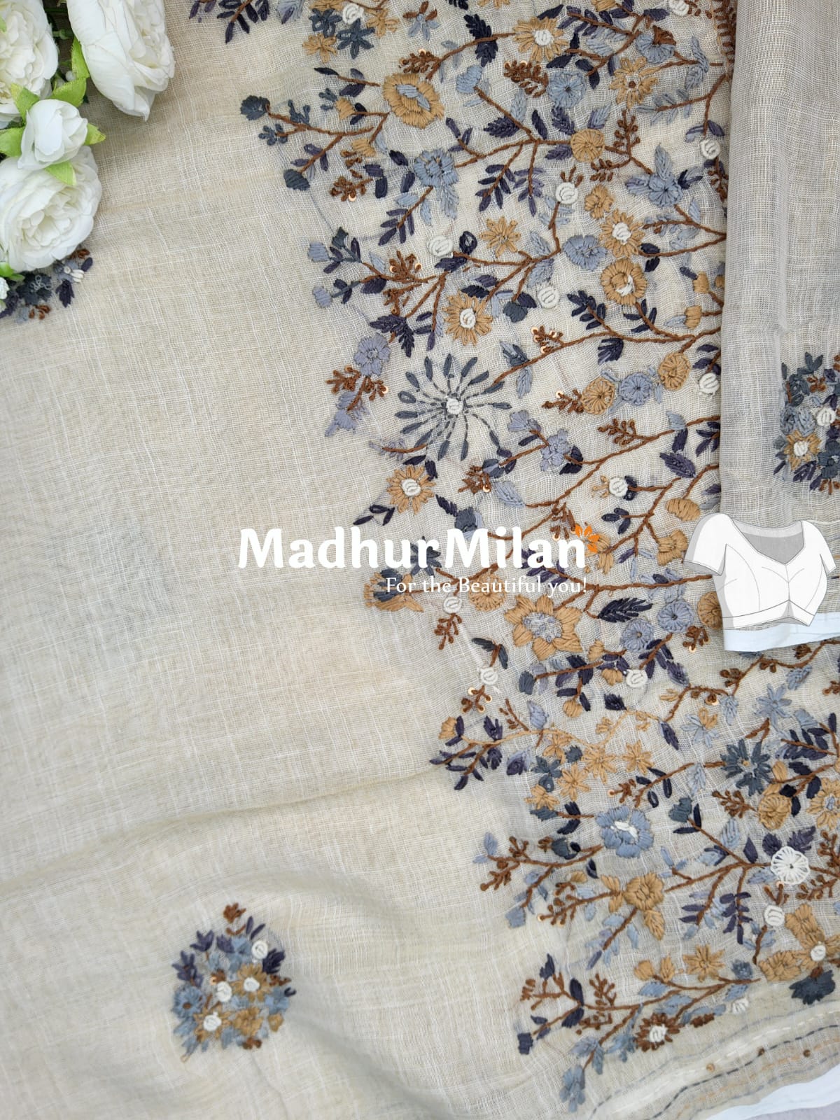 Product Description: LENIN TISSUE EMBROIDERY WORK SAREE CREAM BROWN