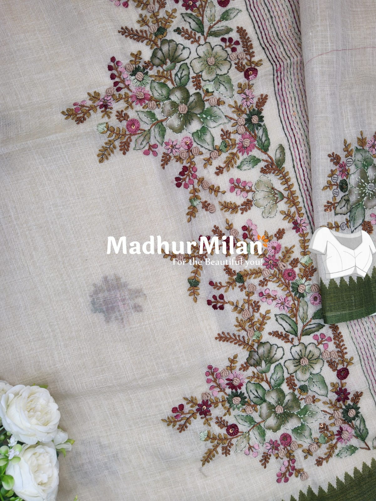 Make a statement at your next event with this stunning LENIN TISSUE EMBROIDERY WORK SAREE CREAM GREEN from Madhur Milan - For the Beautiful You.