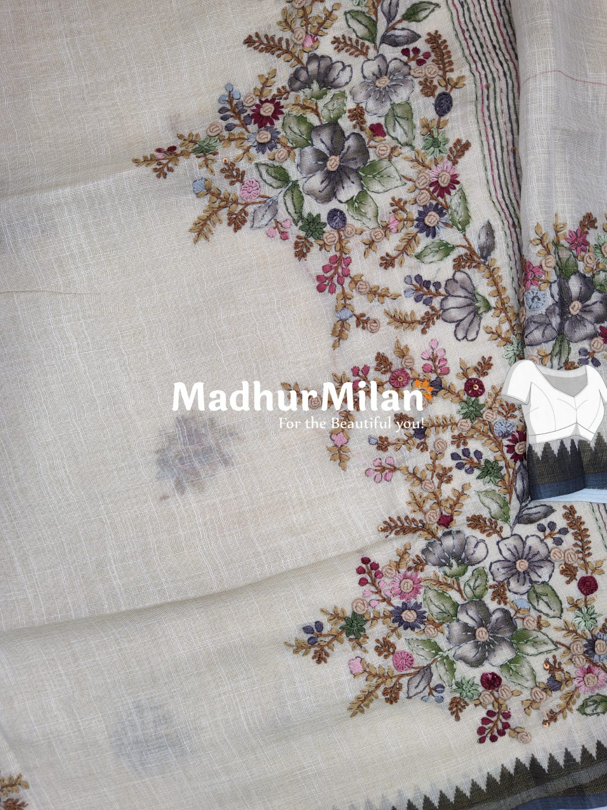 Description: Elevate your ethnic wardrobe with this exquisite Lenin Tissue Embroidery Work Saree in a sophisticated cream and grey palette.