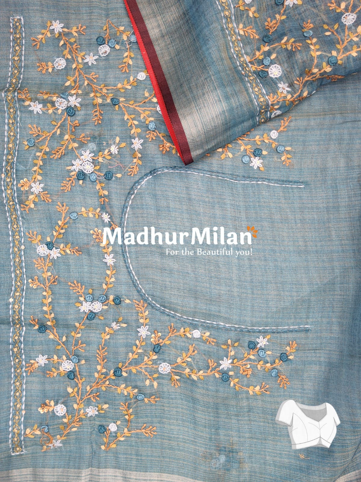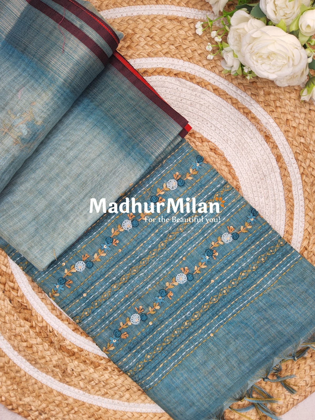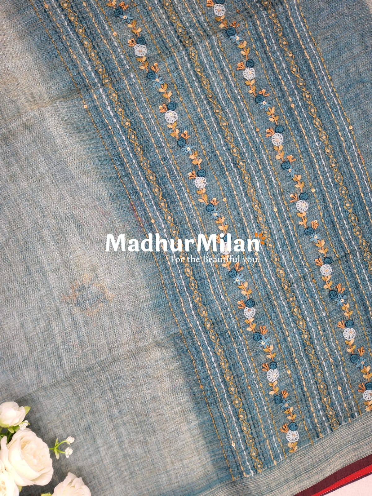 Description: Elevate your ethnic wardrobe with this exquisite Lenin Tissue Embroidery Work Saree from Madhur Milan.