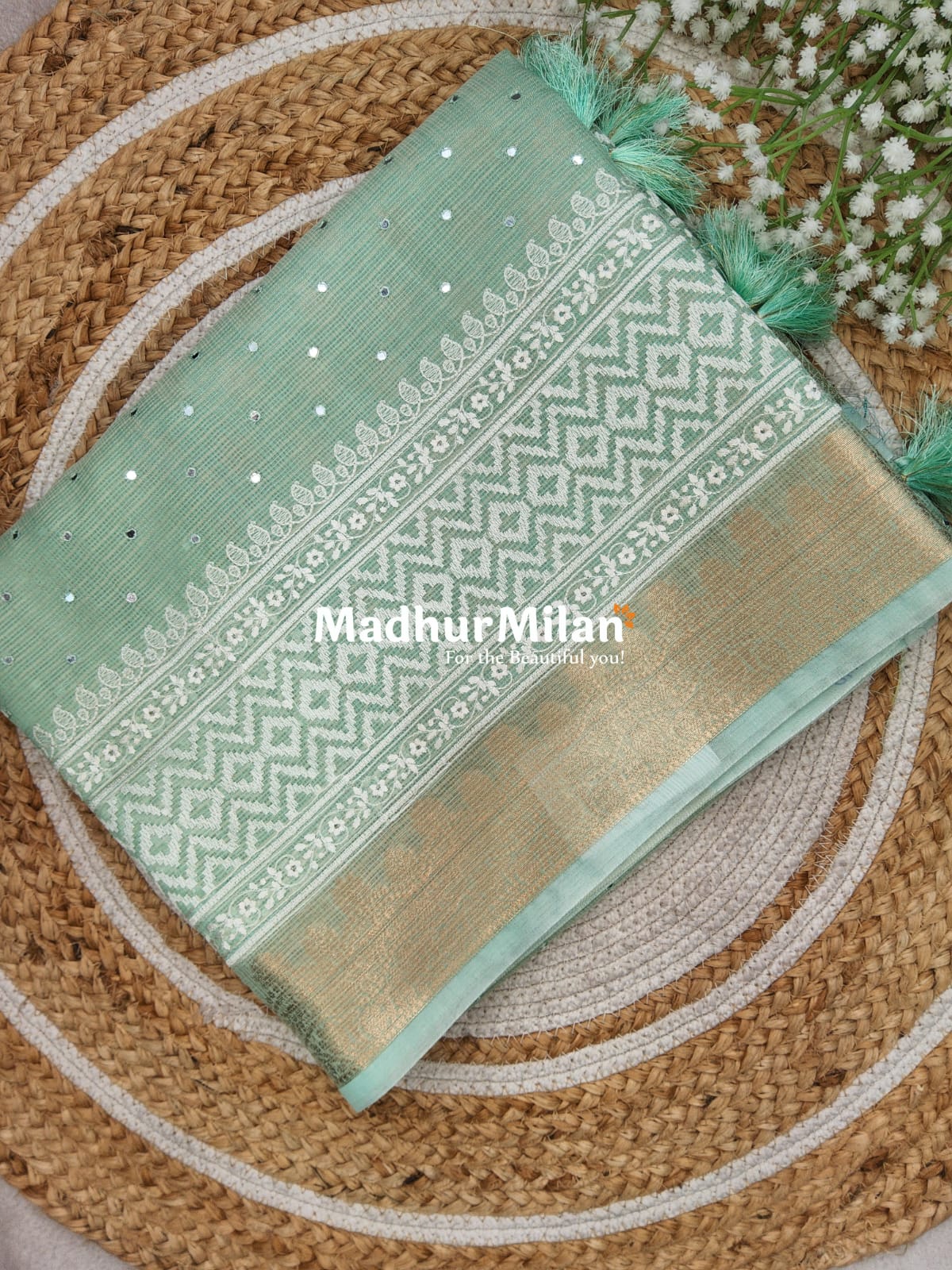 Elevate your ethnic wardrobe with our exquisite Monga Kota Mirror Work Saree in a refreshing Aqua hue.