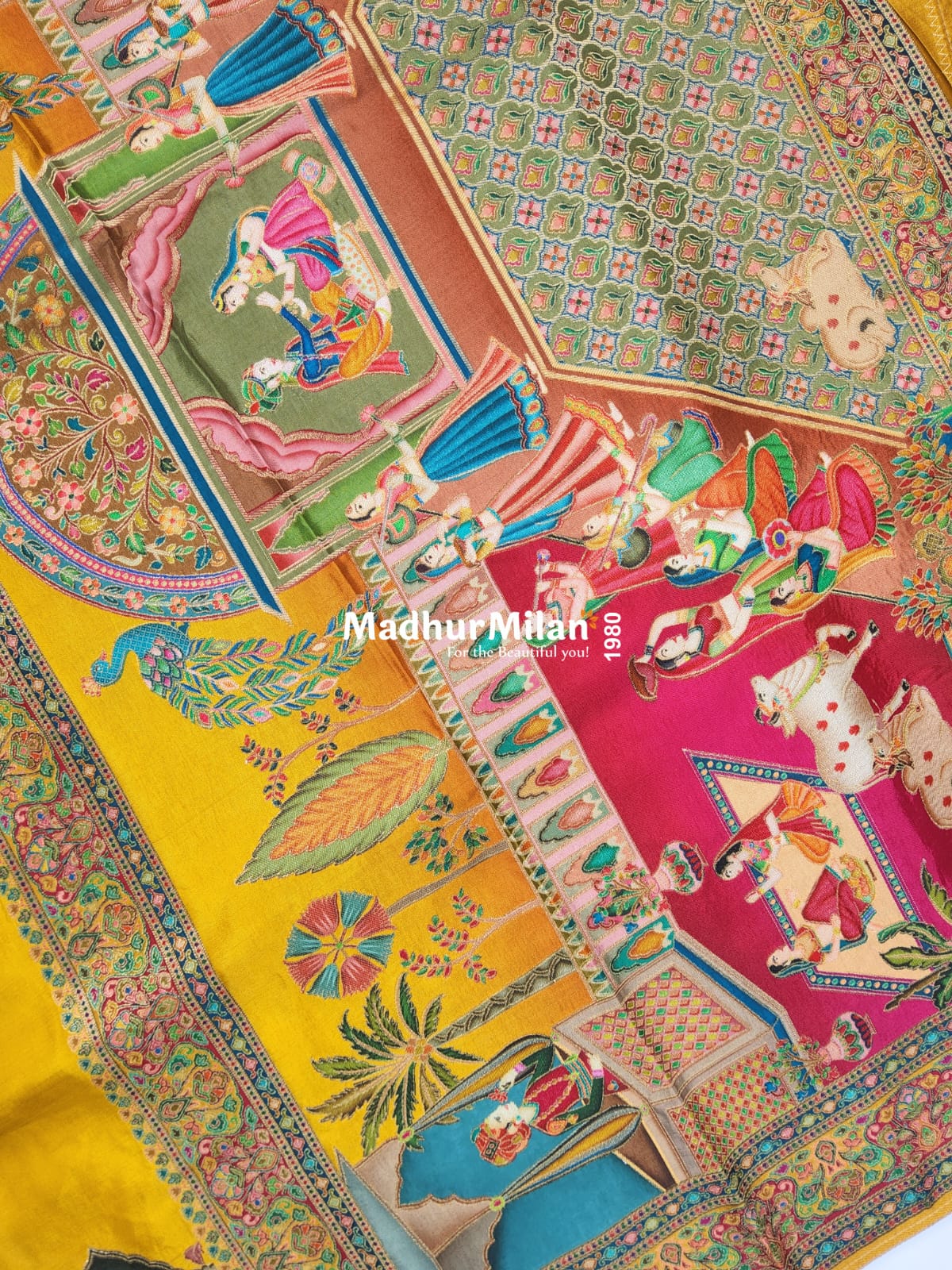 The saree boasts an awe-inspiring pallu adorned with a mesmerizing array of colors and motifs: - Intricate miniature paintings depicting various scenes from Indian mythology and daily life - A harmonious blend of vibrant hues including deep reds, blues, greens, and pinks - Delicate floral patterns and geometric designs interwoven throughout the border The border is a visual feast, featuring: - Ornate paisley patterns - Stylized flora and fauna motifs - Intricate zari work that adds a touch of shimmer and grandeur