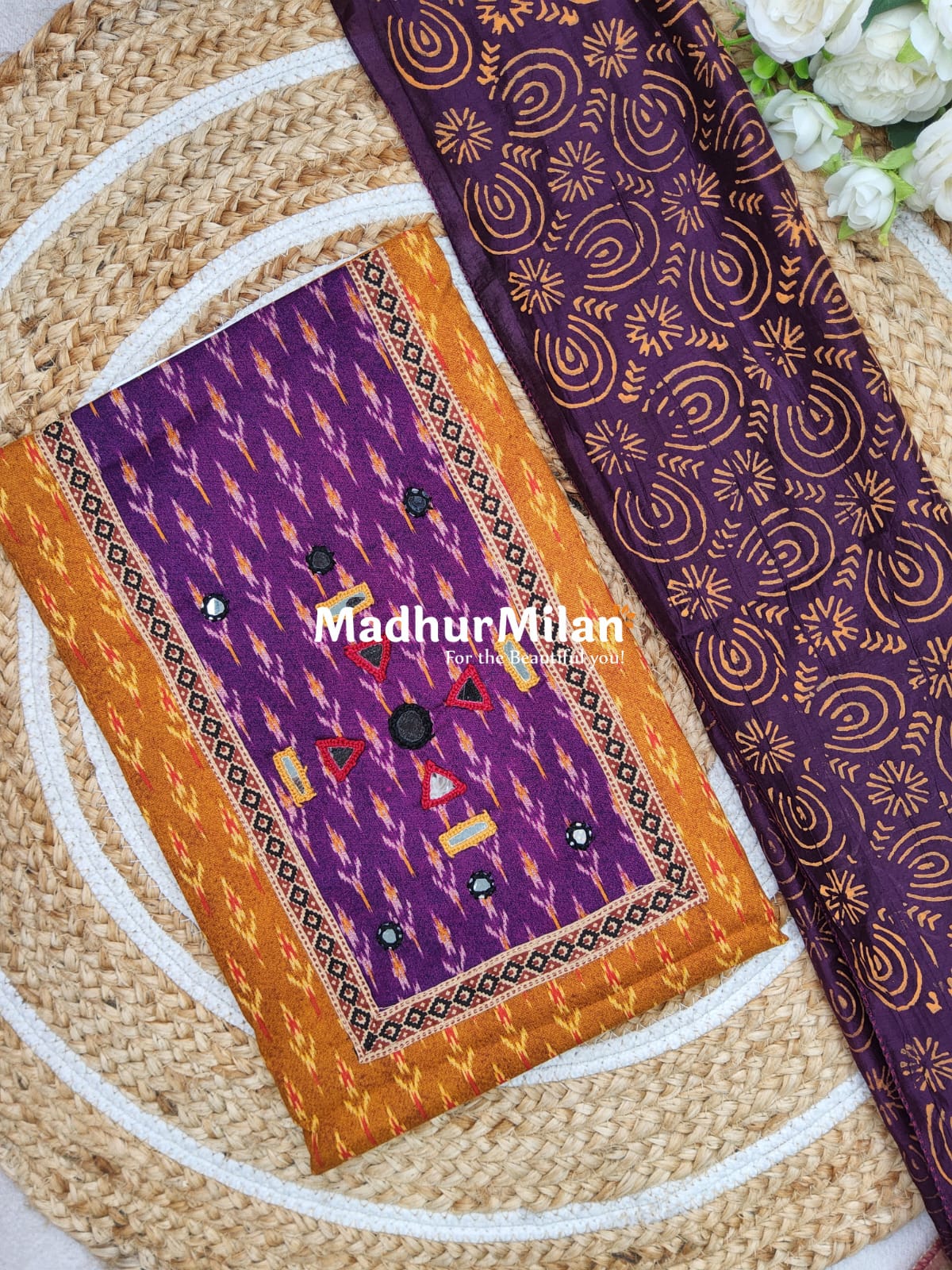 Elevate your ethnic wardrobe with our exquisite PATOLA PRINT COTTON UNSTITCHED SALWAR SUIT in a striking mustard and purple combination.