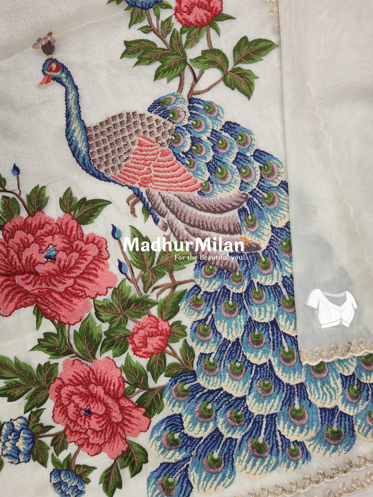Product Description: This exquisite saree is crafted from luxurious cream-colored tissue organza, offering a delicate sheen and ethereal drape that's perfect for special occasions. The highlight of this saree is the breathtaking peacock embroidery work, showcasing the pinnacle of Indian artistry.