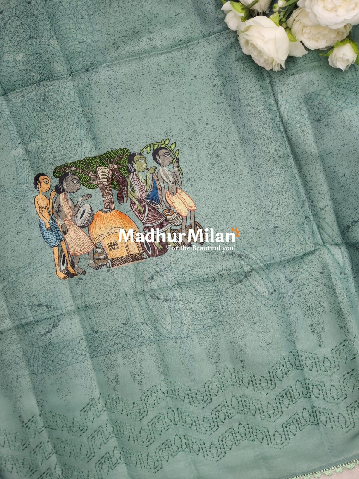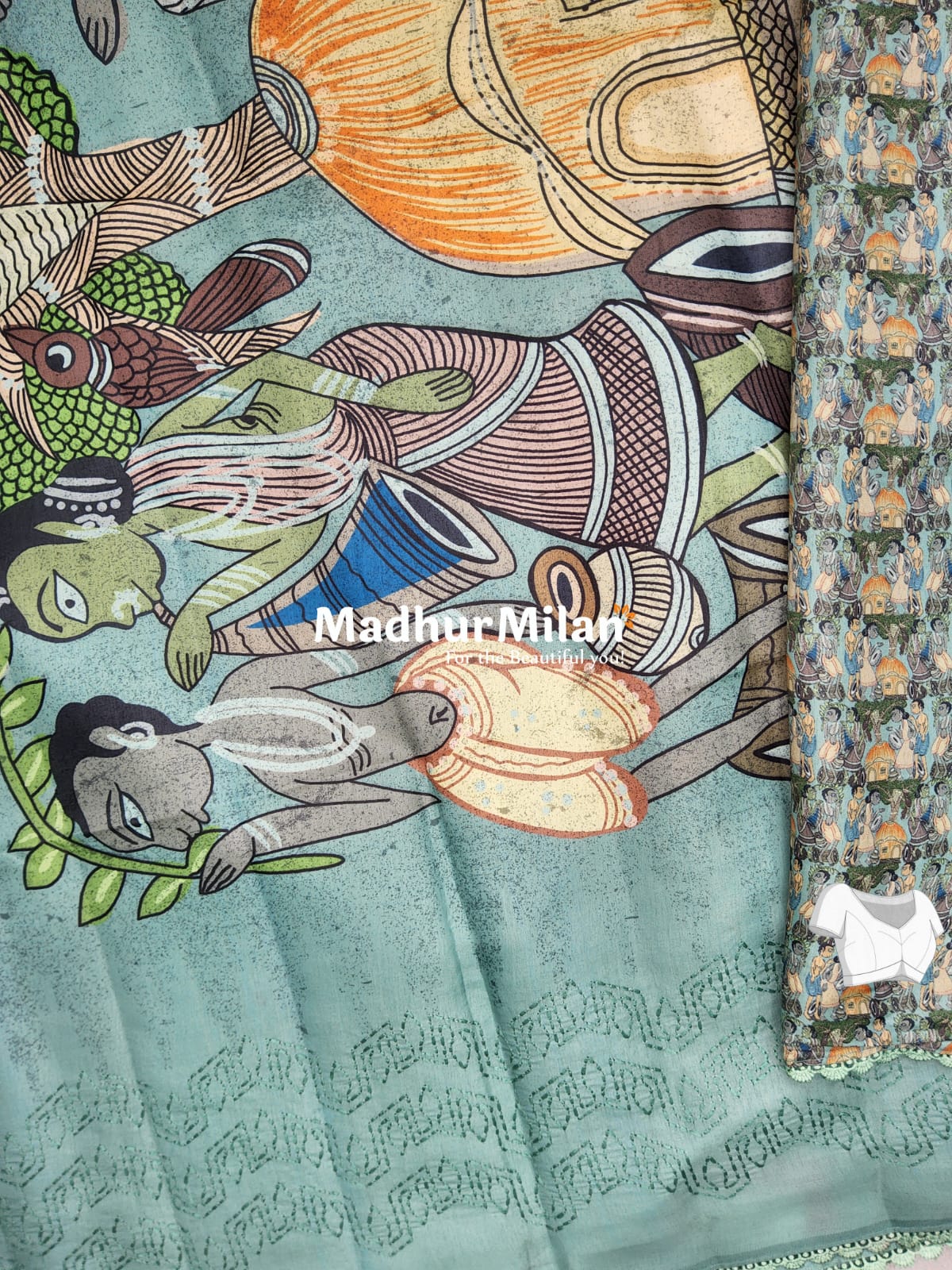 This Madhur Milan creation is perfect for those who appreciate the fusion of art and fashion. Whether you're attending a wedding, festival, or any special occasion, this saree is sure to make you stand out with its unique blend of color, texture, and artistry.