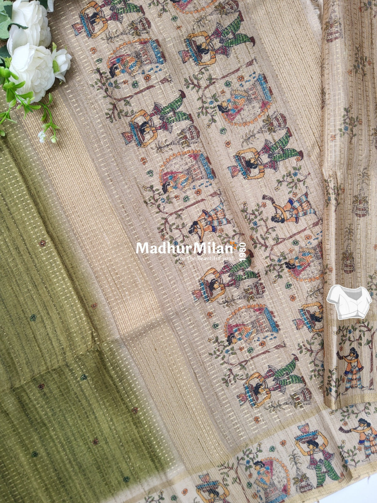 Description: Elevate your ethnic wardrobe with our exquisite PIN STRIPES DIGITAL SEMI TUSSER SAREE MEHNDI.