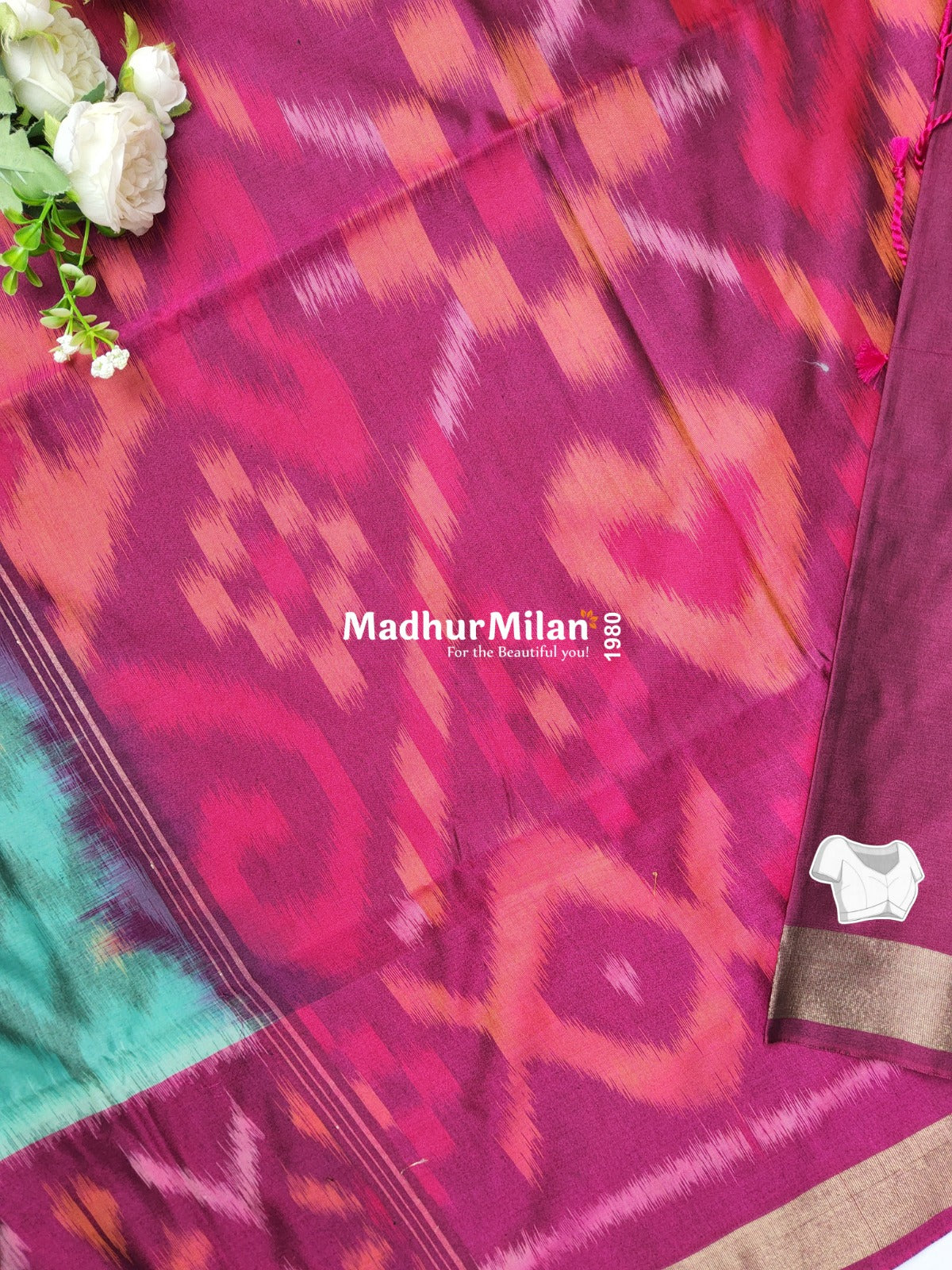 The saree showcases a beautiful teal green body adorned with subtle ikat-inspired patterns, creating a serene backdrop. The showstopper is the vibrant rama pink pallu and border, featuring bold geometric patterns in various shades of pink and orange. The golden tissue border adds a touch of opulence, making it perfect for special occasions. Versatile and timeless, this Madhur Milan creation is suitable for both traditional ceremonies and modern social gatherings. The unique color combination and intricate design ensure you stand out in any crowd.