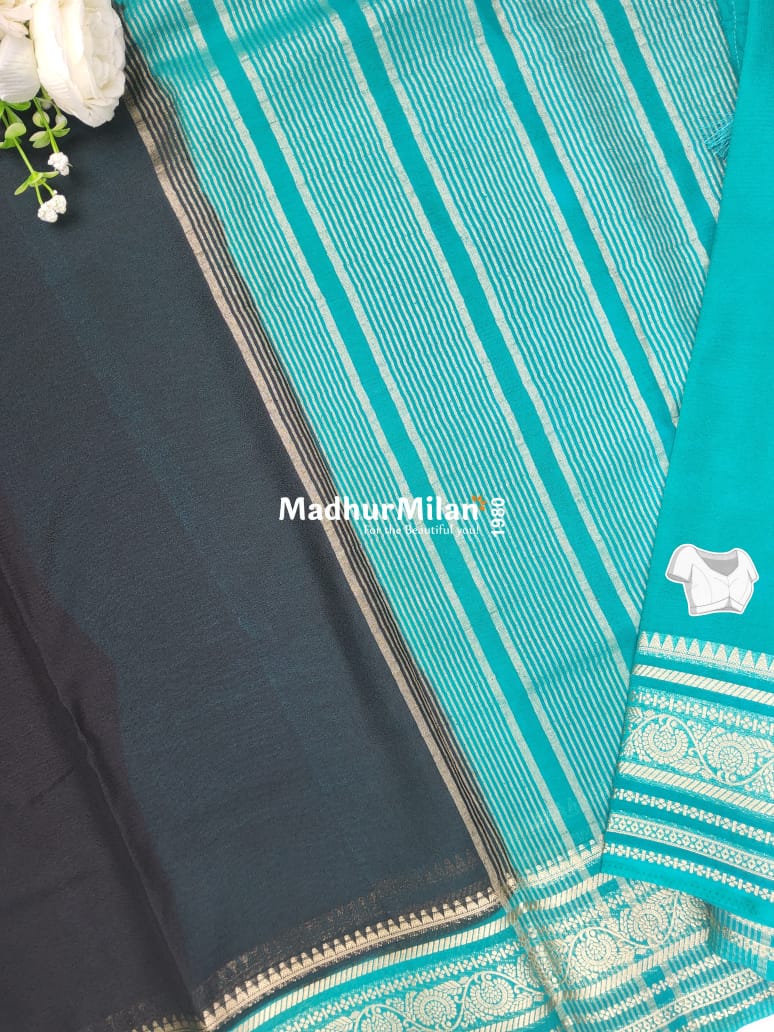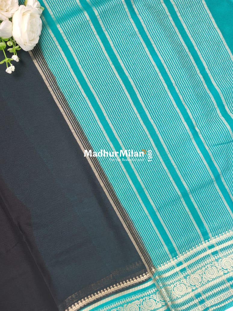 Design Details: The saree boasts a rich black body that exudes sophistication and versatility. The contrasting rama border and pallu add a pop of color, creating a visually striking effect. The pallu features beautiful golden zari work with traditional designs, including circular patterns and intricate borders, showcasing superior craftsmanship.