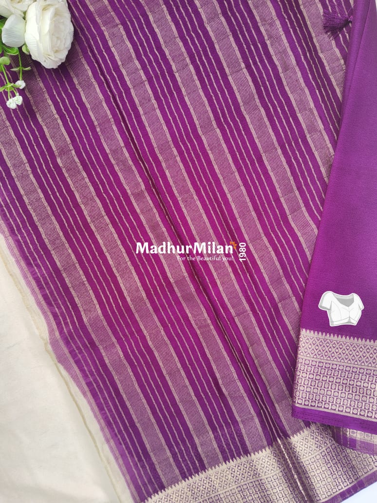 Description: Elevate your ethnic wardrobe with this exquisite Semi Crepe Silk Saree in a stunning combination of cream and purple.