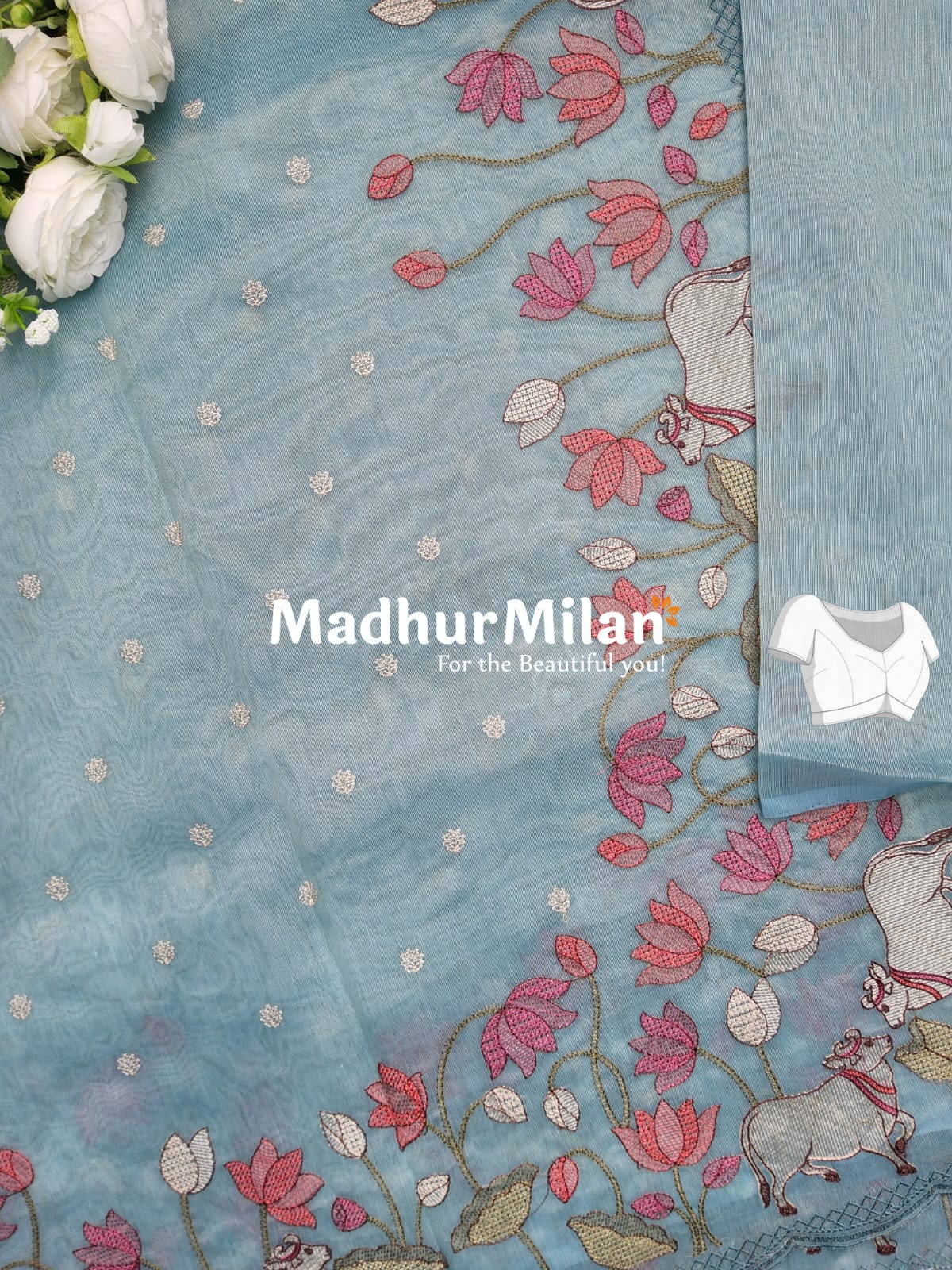 The saree features a stunning composition of embroidered pink lotus flowers and cute elephant figures, creating a unique and eye-catching design. The dusty blue background is adorned with silver polka dots, adding a touch of shimmer to the overall look. The intricate threadwork showcases exceptional craftsmanship, making this saree a true work of art.