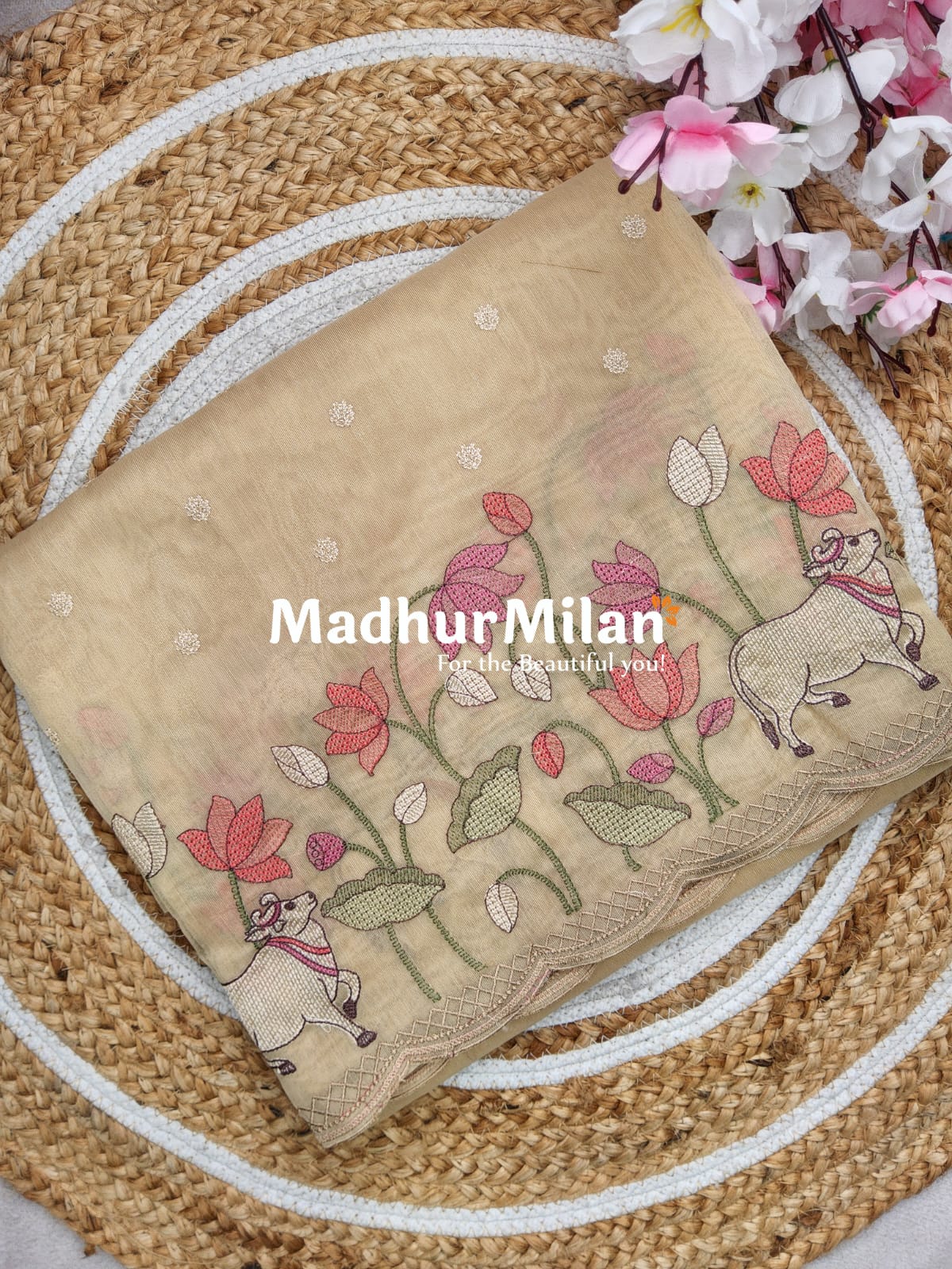 Make a statement at your next event with this stunning LENIN TISSUE WORK SAREE DUSTY GOLD from Madhur Milan!
