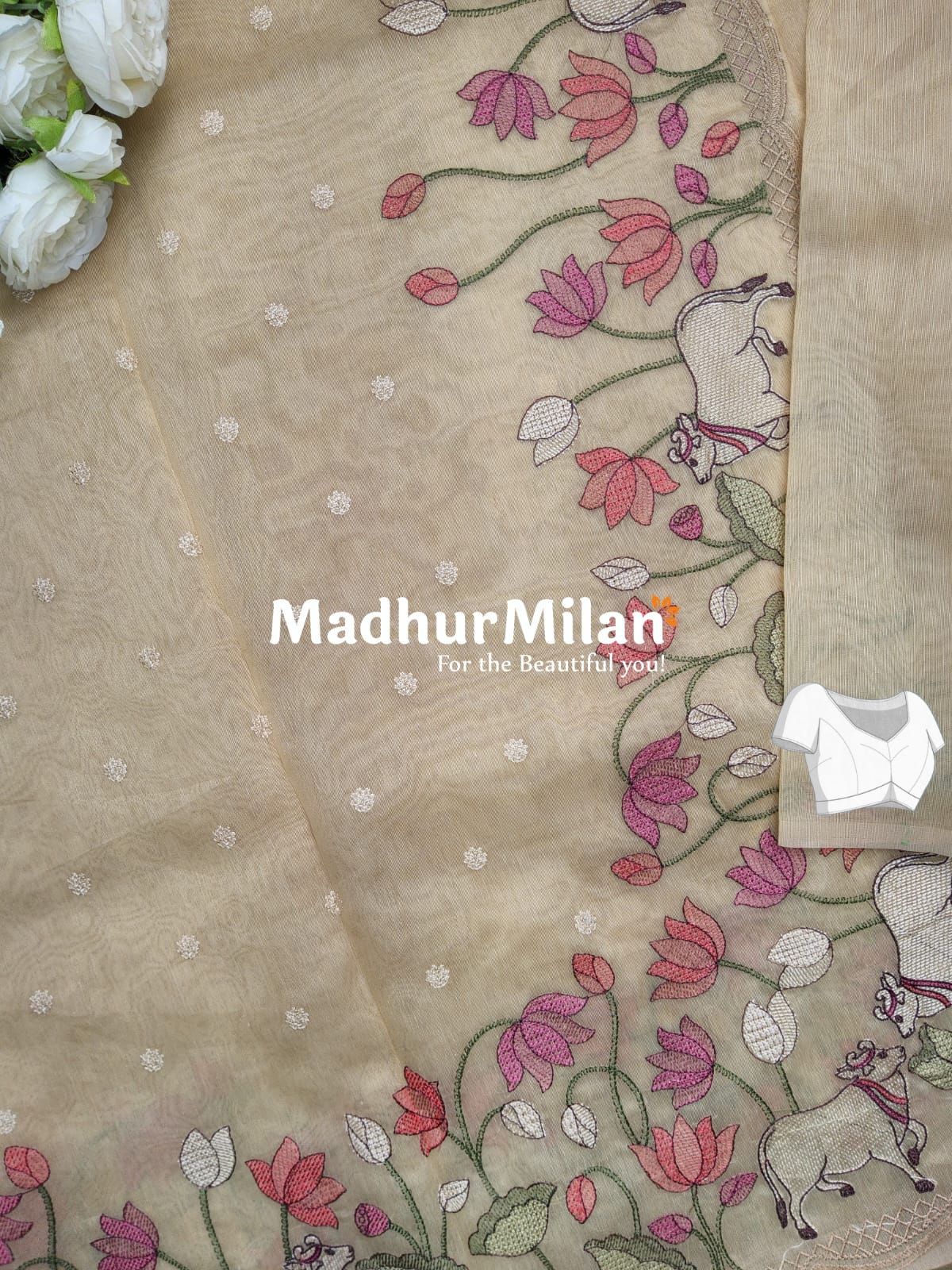 The saree showcases a mesmerizing border with meticulously embroidered pink and white lotus flowers, complemented by green stems and leaves. Adding a whimsical touch, the design includes charming animal figures, creating a unique and eye-catching pattern. The body of the saree is adorned with subtle white dotted embellishments, enhancing its overall elegance.