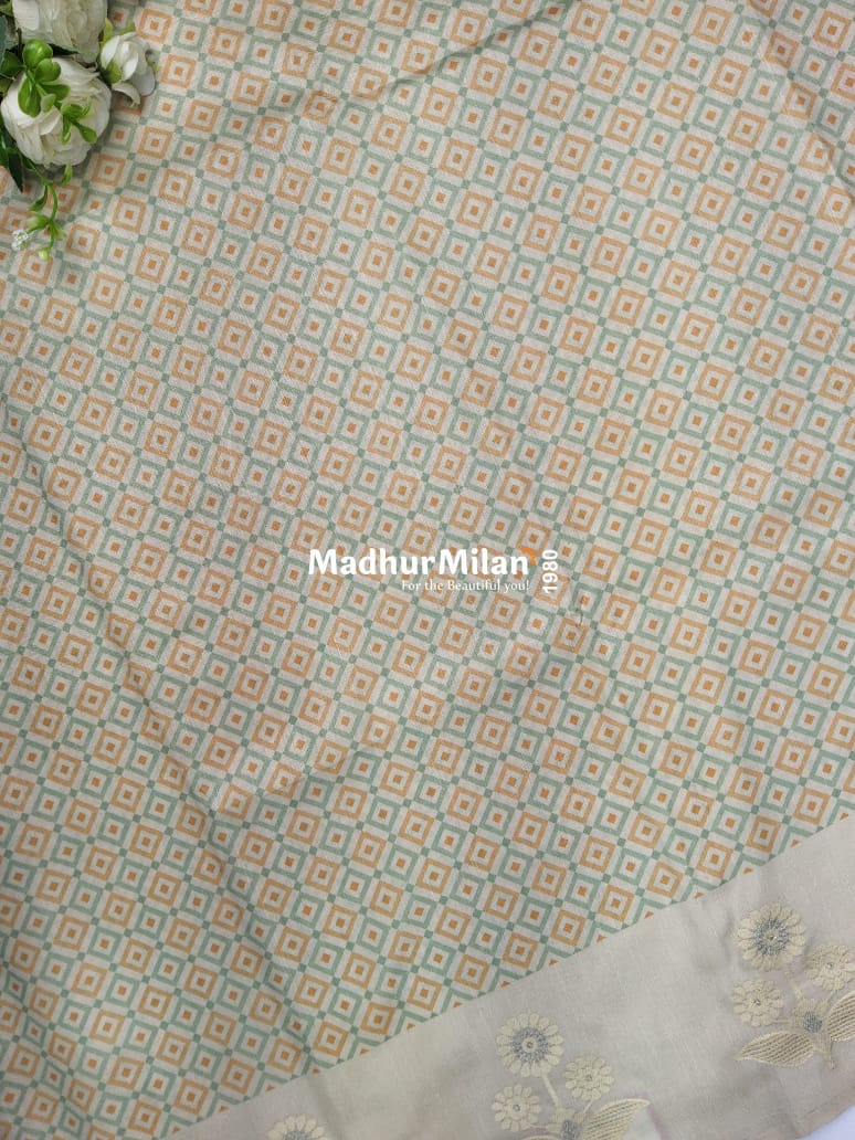Elevate your ethnic wardrobe with this exquisite Semi Tusser Embroidery Border Saree in a refreshing green hue. This saree is a perfect blend of traditional craftsmanship and contemporary design, making it an ideal choice for both festive occasions and formal events.