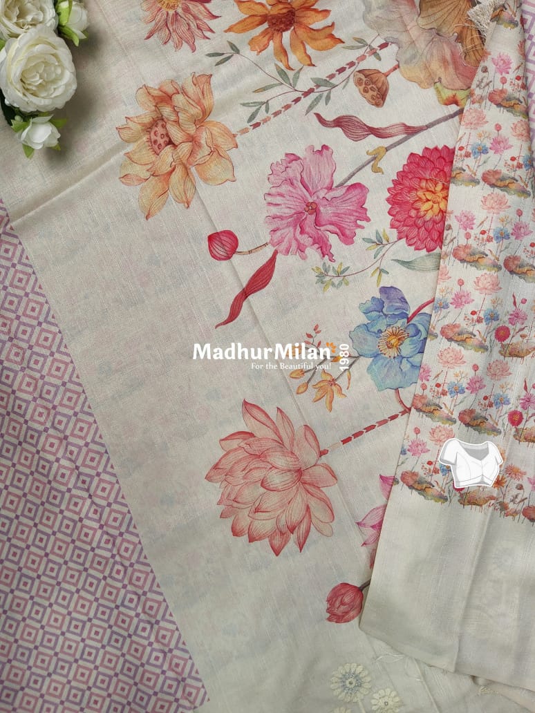 Elevate your ethnic wardrobe with our exquisite Semi Tusser Embroidery Border Saree in a soft lavender hue. This stunning saree seamlessly blends traditional craftsmanship with contemporary design, making it perfect for both festive occasions and elegant soirées.