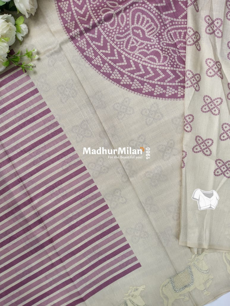 Brand: Madhur Milan - "For the Beautiful you" This Semi Tusser Embroidery Border Saree in Lavender is a testament to timeless elegance and superior craftsmanship. Its unique combination of stripes and traditional motifs makes it a versatile addition to your wardrobe.