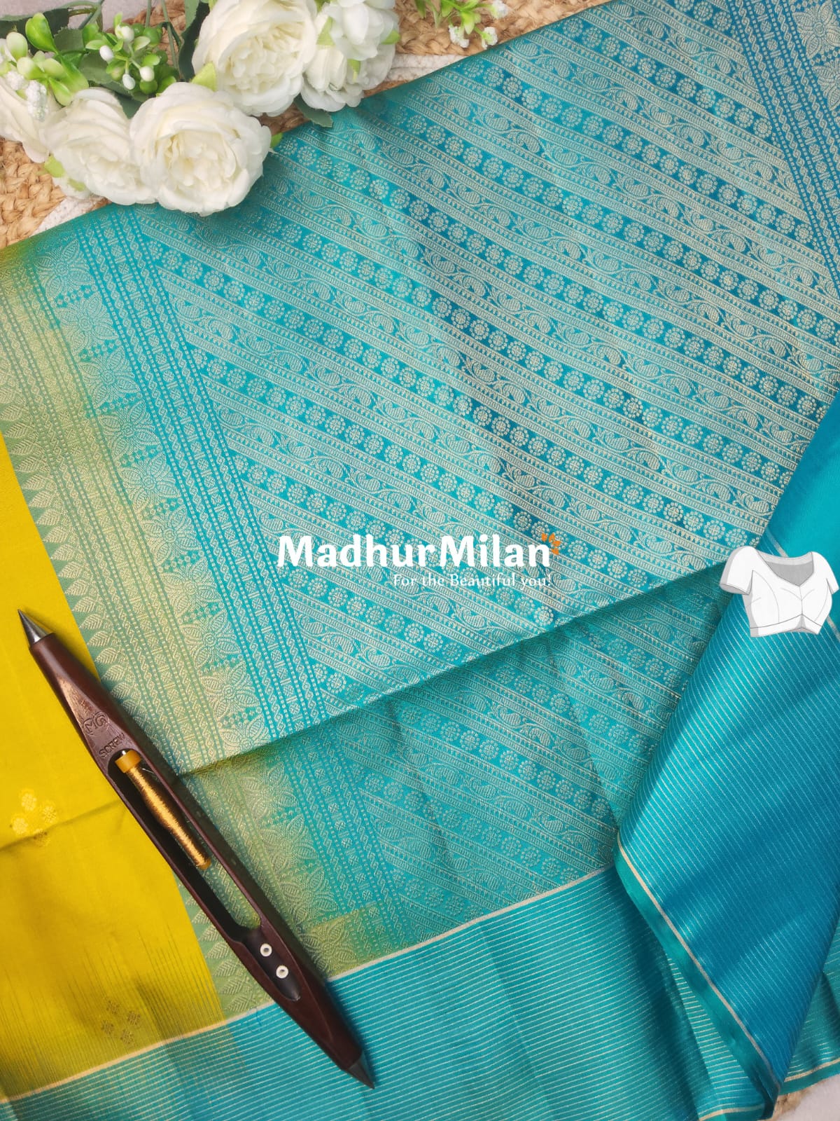 This stunning saree combines the vibrant hues of lemon yellow and firozi (light turquoise) to create a mesmerizing visual appeal.