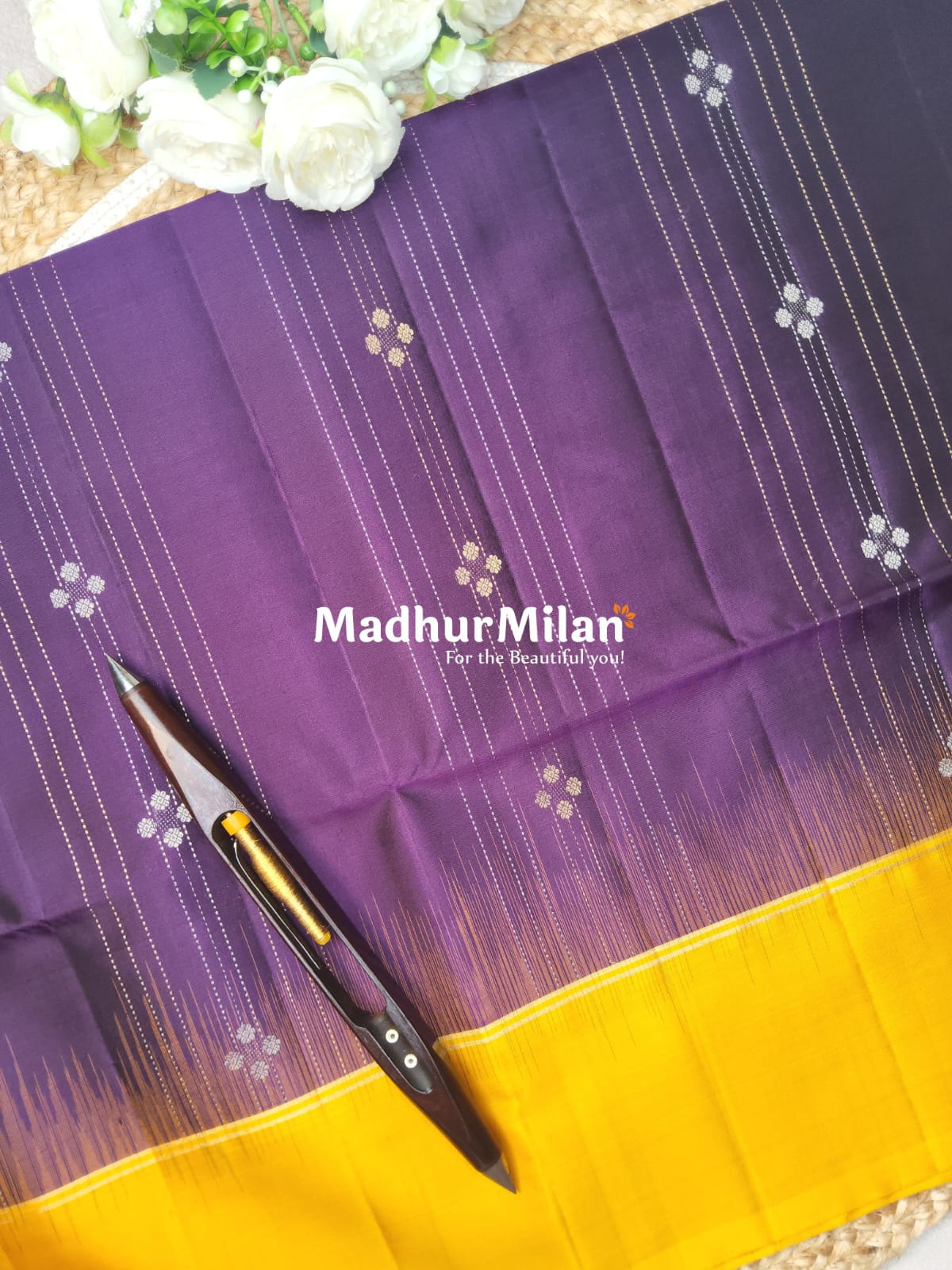 2. Colors: A striking combination of deep purple body with a vibrant golden border and pallu.