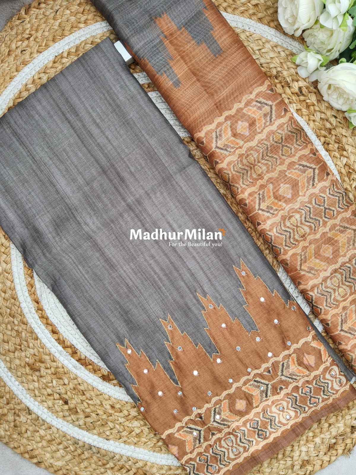 - Top: Grey Chanderi silk with gold temple border and embroidery at the bottom