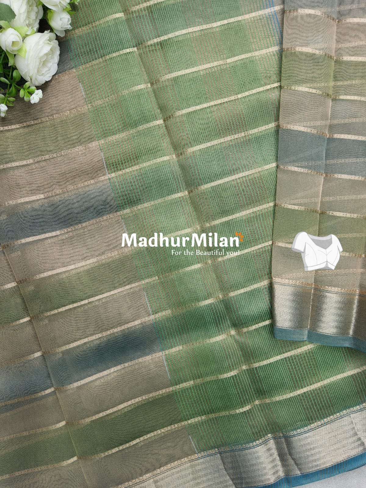 Introducing the TISSUE ORGANZA STRIPE SAREE DUSTY RAMA GREEN by Madhur Milan - a stunning blend of elegance and contemporary style for the beautiful you!