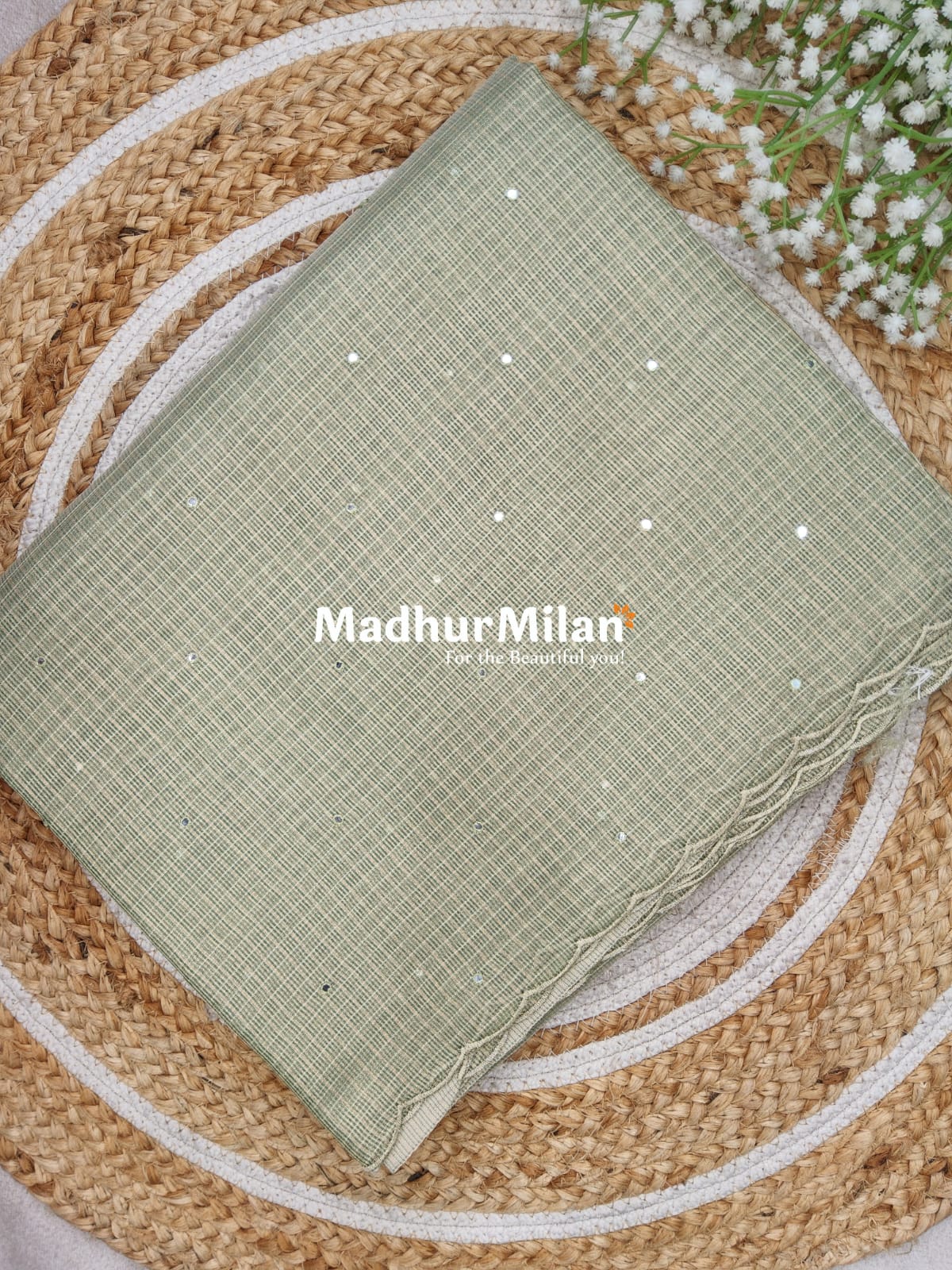 Elevate your ethnic wardrobe with our exquisite Tissue Kota Work Saree in a soothing Dusty Green shade. This masterpiece from Madhur Milan combines traditional craftsmanship with contemporary elegance,