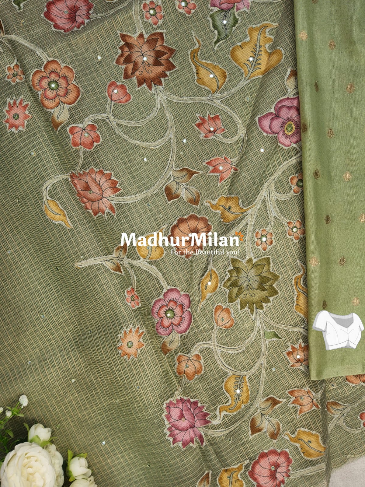 The saree features a beautiful contrast between the subtle dusty green base and the vibrant floral artwork on the pallu. The tissue kota fabric ensures a comfortable drape while the scattered sequins add a festive touch. The intricate floral design showcases skilled craftsmanship, making this saree a true work of art.
